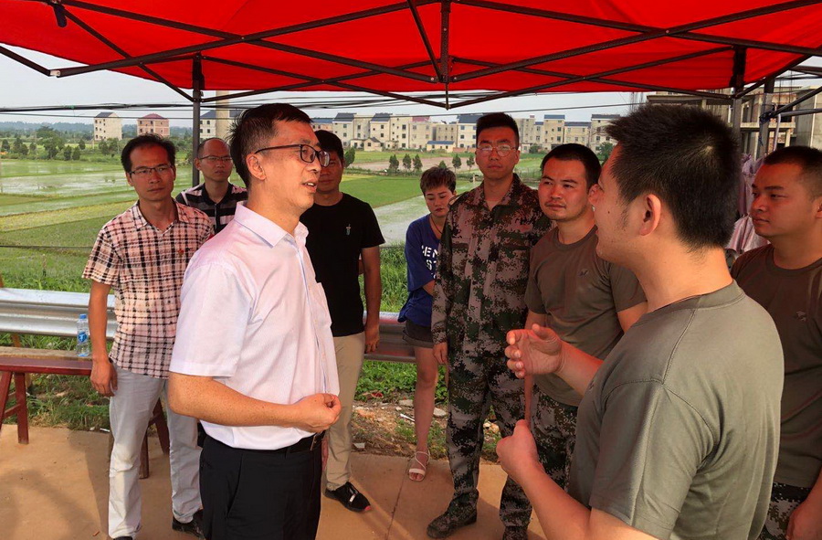 7月24日下午,集团公司纪委书记李仕文前往鄱阳防汛段看望慰问防汛救灾一线的青年突击队员。当地防汛段负责人驻村书记王云才向李仕文详细介绍了该防段堤坝的具体情况和当前防汛工作的重心。王云才谈到当前我省防汛应急响应由一级下调至二级,但堤坝经长时间浸泡后仍有较大隐患,此时更应加强巡堤查险工作,不可麻痹大意。