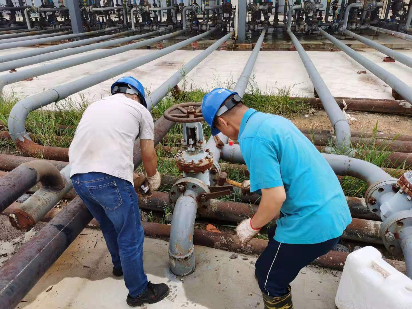 103-104转注淡钙液时发现淡钙液注水管堵塞,各运行值连续两天,轮流敲打、冲排等不见成效。8月23日,经过讨论,决定停淡钙液泵开孔疏通然后用冷凝水泵反冲洗。方案确定,但是执行困难,需要停淡钙液泵,排空注水主管,开孔疏通,纯碱淡钙液不能停送,检修正在对106井进行施工。支部书记、车间主任祝龙组织大家开现场会,段长傅华南表态给半个小时就能够完成,焊工继续施工106井,其他人员开孔疏通103管,值长方小根跟着表态半个小时完成停泵、关10个单井阀门、排水以及维修完成后尽快恢复泵及阀门运行。团结就是力量,经过40分钟争分夺秒的战斗,顺利完成103管疏通工作,106井施工也未耽误,接班的四值立即对阀门室排出的大量淡钙液进行冲洗。