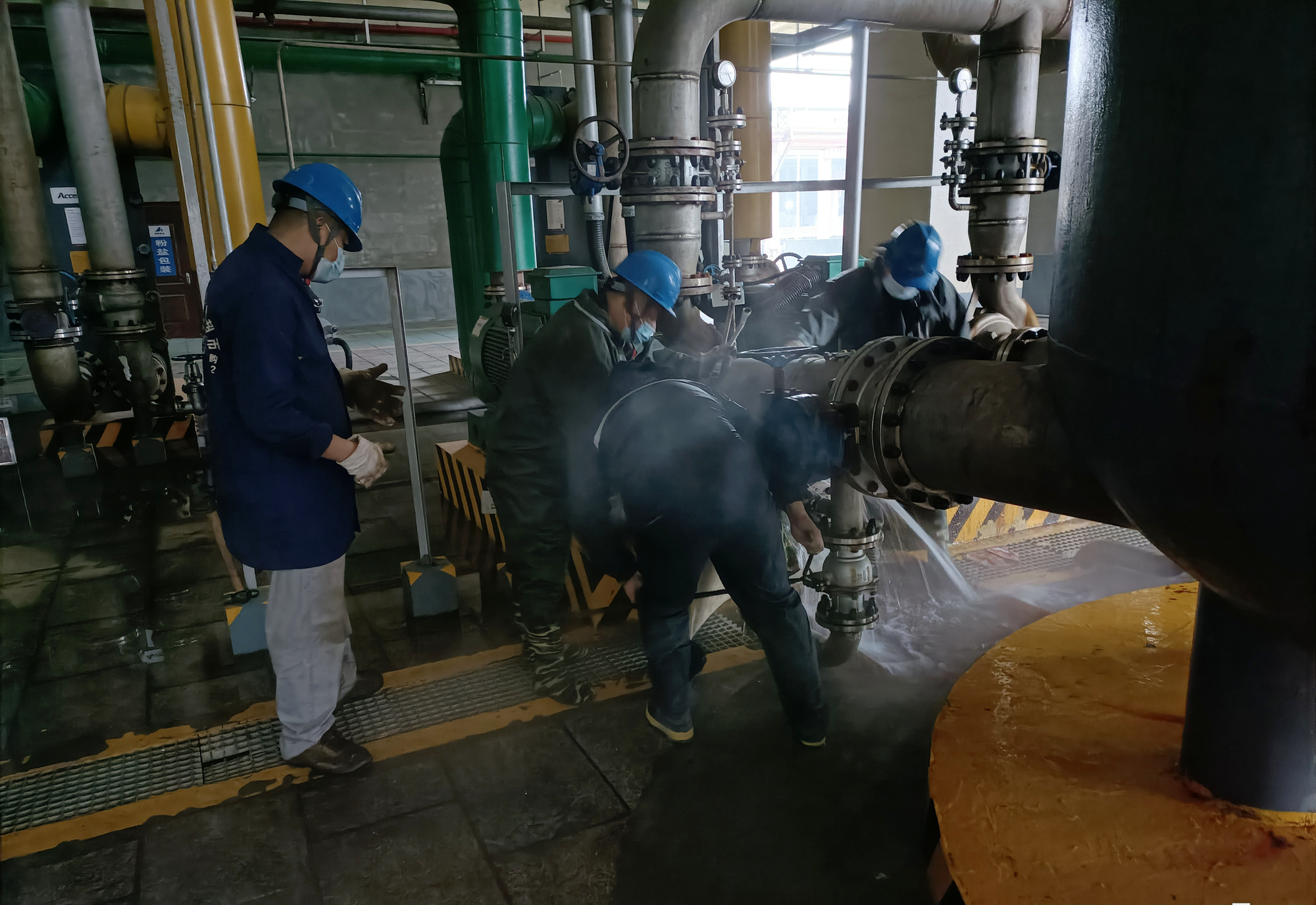 为尽快完成抢修任务,保障生产的稳态运行,盐钙车间立即与生产技术部协调,最终确定了无需停用生产用水的抢修方案和应急预案。说干就干,安全员现场督导,在做好各项安全防护措施下,党员和技术骨干带头冲锋在前,检修人员和车间运行操作人员分工明确、紧密配合。在全员的通力协作下,不到20分钟就完成该垫片更换,成功消除了隐患,未对生产运行造成影响。