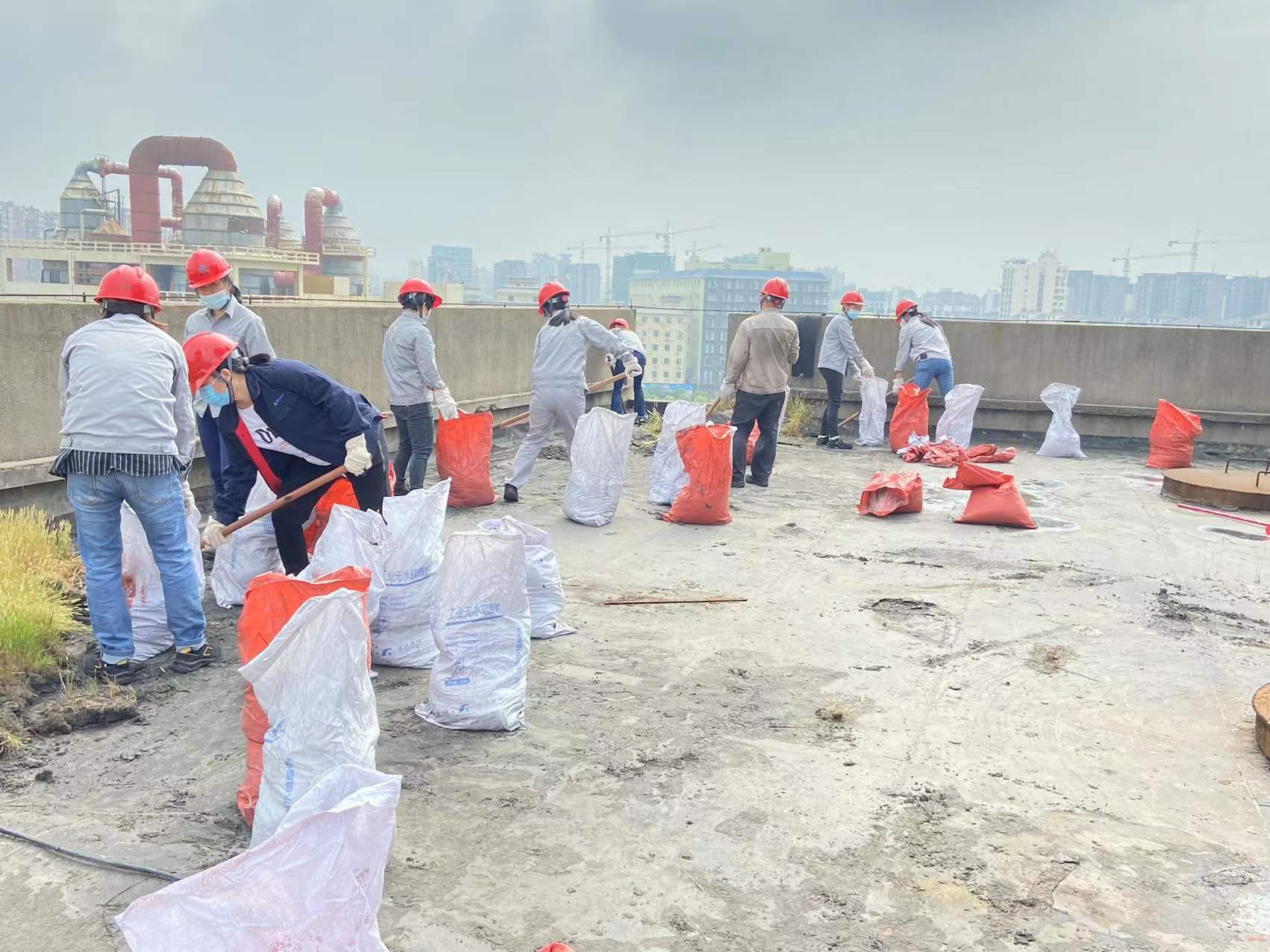 我属于后勤组,跟随大部队登上了厂房顶层。平时习惯了在锅炉上下金属丛林间来回穿行,现在用平行的视角浏览厂区的一草一木,视角一新,大有一种“会当凌绝顶、一览众山小”的豪迈感。视野突然开阔,连带着心境也豁然开朗,手上的动作也跟着轻快起来。不消多时,主厂房楼顶被清理得干干净净。