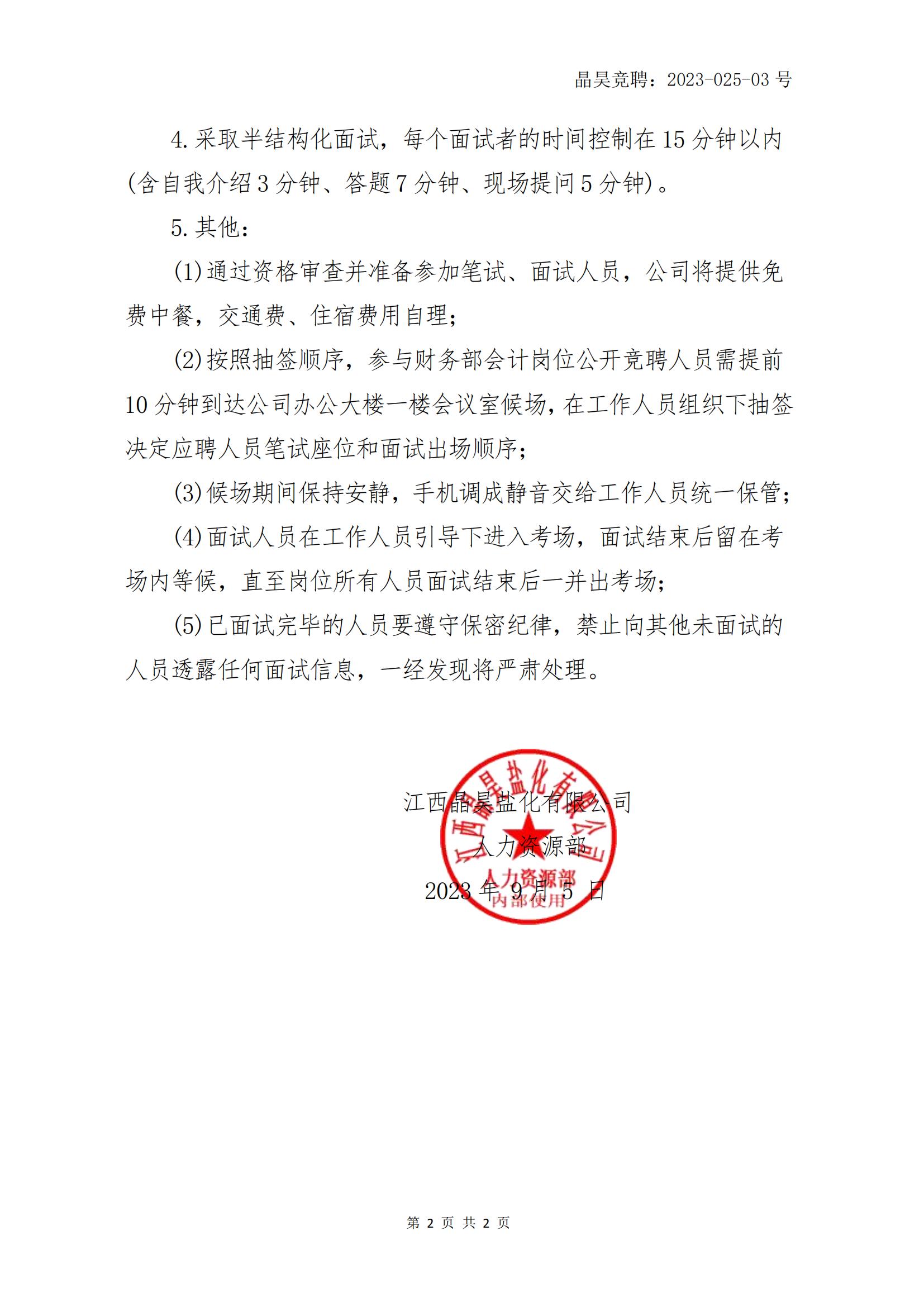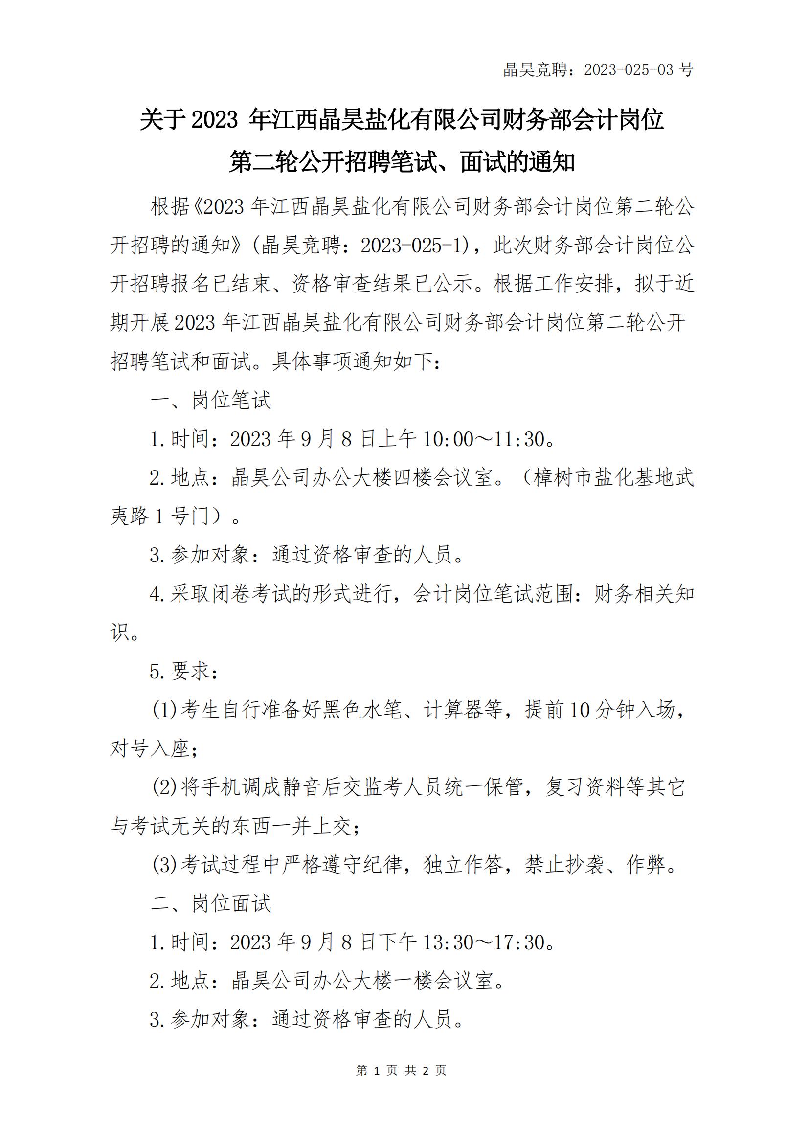 关于 2023 年江西晶昊盐化有限公司财务部会计岗位 第二轮公开招聘笔试、面试的通知