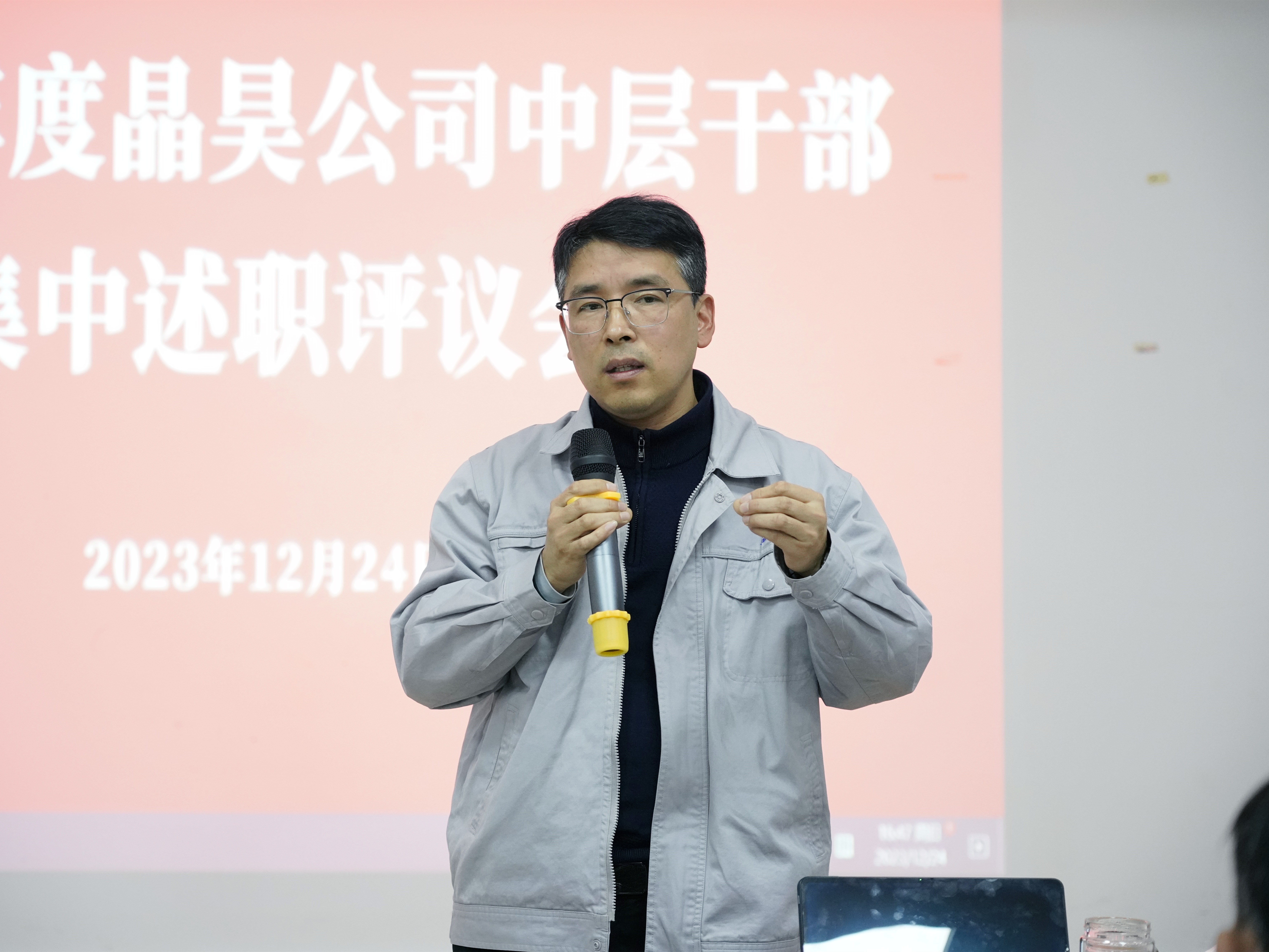 雷和波作总结讲话,就述职的必要性、付出就有回报两个方面回顾了过去一年的工作并肯定了大家的付出。关于2024年的工作思路,雷和波提出了5个方面工作要求。一是廉洁自律,勤廉晶昊,推进全面从严治党。全体党员干部职工要坚定理想信念,永葆清正廉洁。二是规范操作,完善程序,做好本职工作。既要保证生产经营,又要诚信合规,做到实事求是工作,防范风险,合理开展工作。三是定量分析,摸清家底,优化现有工作。大家要深入一线了解实际情况,以“第一手”资料作依据,科学作决策、优化工作流程及方式方法。四是心态放正,多些正能量,少些负面情绪。要带头传递好正能量,弘扬好正能量,清除身边的负面情绪,认认真真当好“运动员”,少当“评论员”。五是敢于斗争,敢于担当,掀起新的高潮。面对未来市场的不确定、项目建设的不可控、新产品的开发,各位中层干部要提升自身的抗风险能力,以不变应万变,为企业再创佳绩作出新的更大贡献。