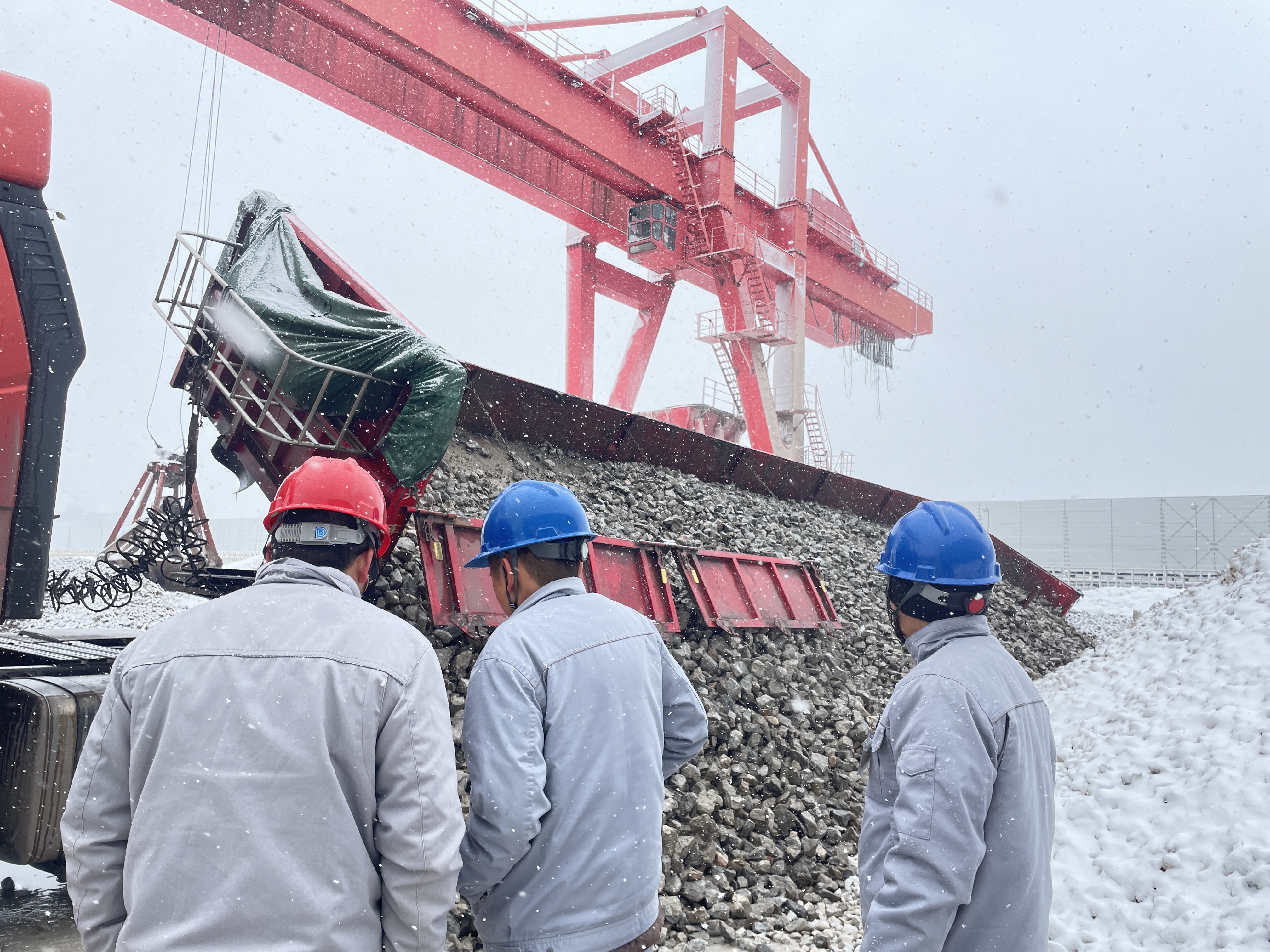 默默坚守岗位,确保稳定供料。强雨雪天气对仓储车间大宗原材料入库及输送带来较大挑战。年关将至,正是大宗原材料石灰石及焦炭入库的关键时期,面对大范围雨雪、寒潮降温天气,纯碱五支部仓储车间充分发挥基层党组织战斗堡垒作用和党员先锋模范作用,压实责任、排查隐患、细化措施,完善应急预案,确保大宗原材料供应稳定。在露天堆场D区,班组长组织皮带工进行石灰石外观验收工作,确保石灰石第一时间卸货入库;行车工及时清理装卸桥两侧路轨上积雪,保质保量完成班次1000多吨的供料工作,为纯碱系统安全稳态生产保驾护航。
