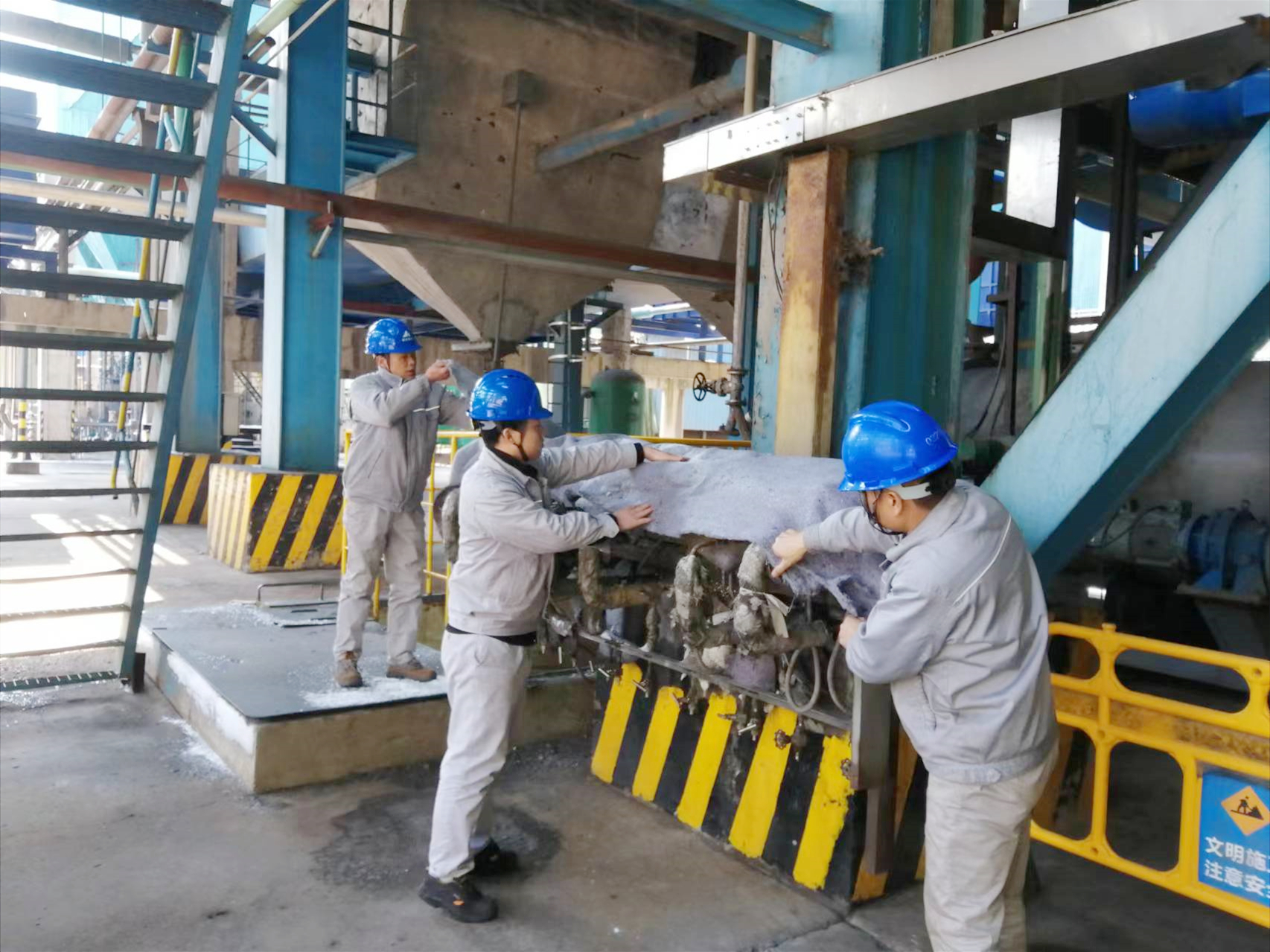 以动制“冻”,快速响应。生产管理部组织设备管理员深入生产现场一线,开展设备防寒防冻专项巡查,及时清查设备积雪、冰冻情况,排查安全隐患;调度员电话通知各生产单位加强设备巡检工作的同时,暖心提醒要注意人身安全,小心地面积雪打滑;同时安排人员及时清扫中控楼门口上下楼梯雪水,并张贴安全标语,保障员工出行安全。动力车间提前做好设备防冻预案,落实设备保温防护措施,在下雪天气组织人员进行通道、楼梯和设备清除积雪消除不安全因素;富达电仪检修车间全面行动,风雪夜分兵几路,巡检各处电器仪表;热电车间对布袋除尘器气缸气路管道、热电仪表引压、导压管采取保温措施,用实际行动为企业安全生产保驾护航。
