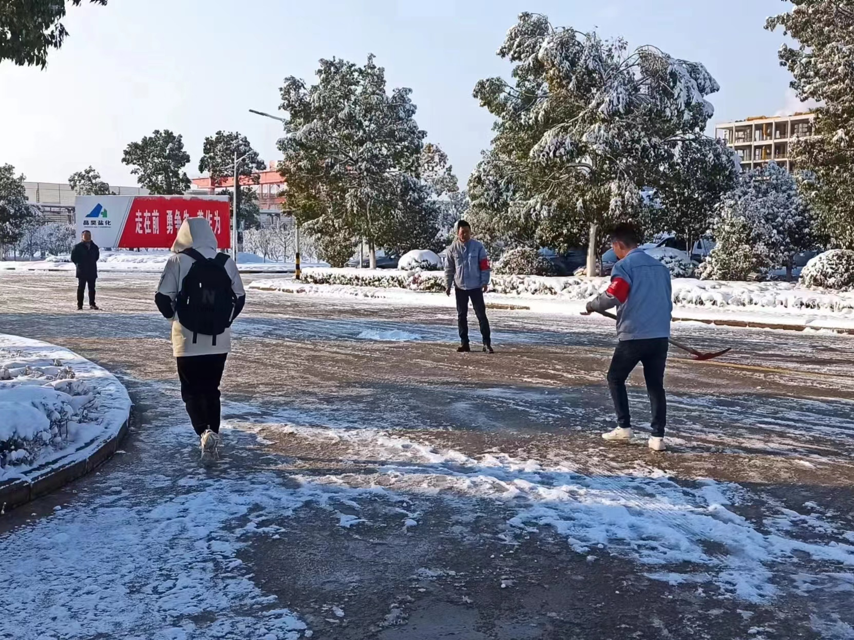 提前谋划部署,保障出行安全。总经理办公室在寒潮到达之前便做好各项寒潮天气防范部署工作,及时将预警信息、灾害风险预警提示通过微信群传达至公司各部门及外协单位负责人,引导干部职工做好防范应对准备。1月22日,樟树市迎来2024首场降雪,针对本次降雪量大、道路结冰等情况,部门领导主动靠前指挥、主动担当尽责,组织支部党员、部门管理人员、巡逻队、绿化队及保安队员及时开展厂区主干道、办公区域和食堂周边路面扫雪、除冰、泼洒融雪剂等工作,对厂区内树木的巡查、维护,对积雪承重的树木进行人工除雪。同时,在公司办公区域布置防滑地毯、防滑警示带,在醒目位置放置警示牌,确保道路行车和职工群众上下班出行安全。22日晚,富达公司综合部及时在各车间湿滑人行路段,露天台阶,楼梯处撒盐融雪,保障员工行走安全。