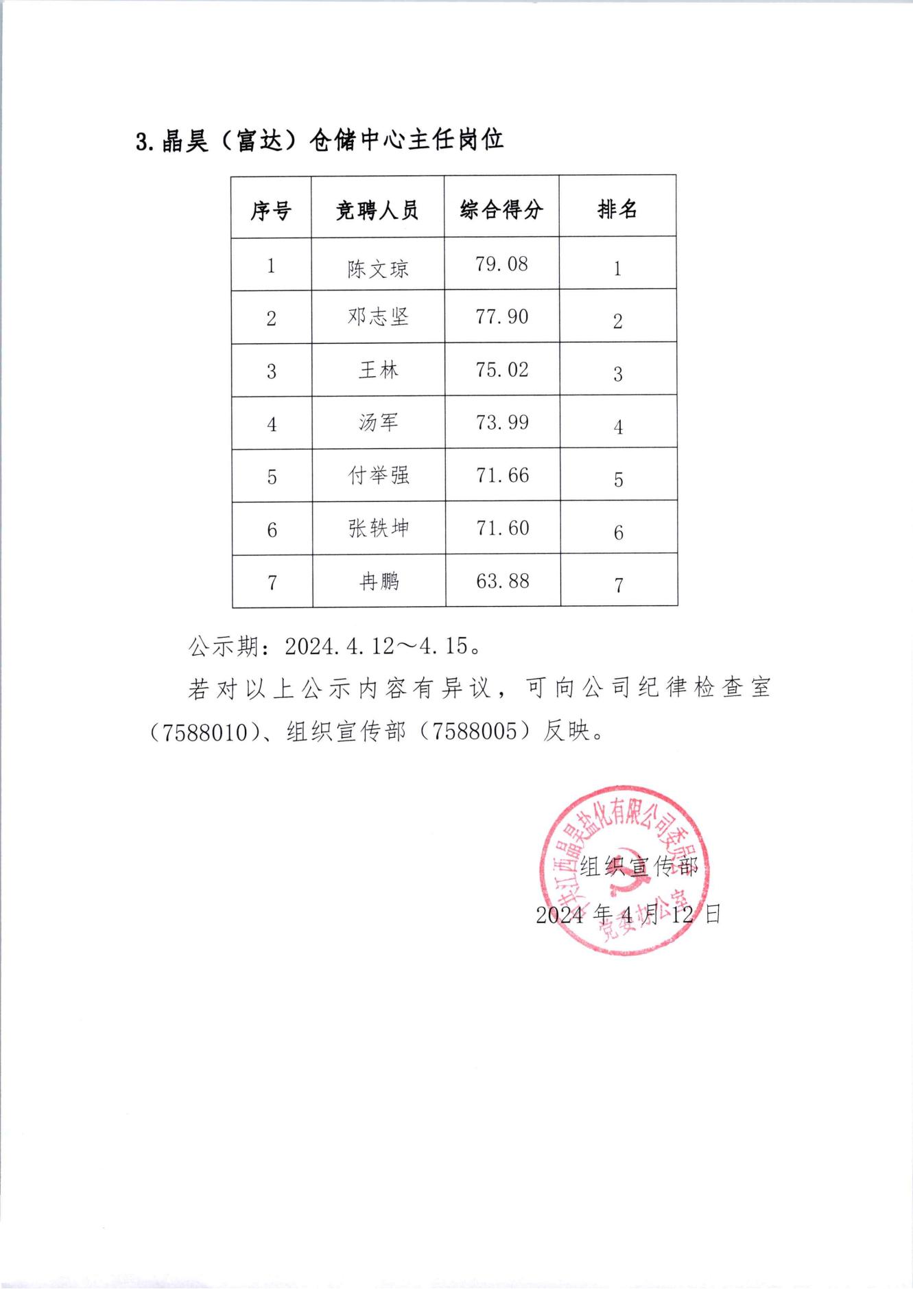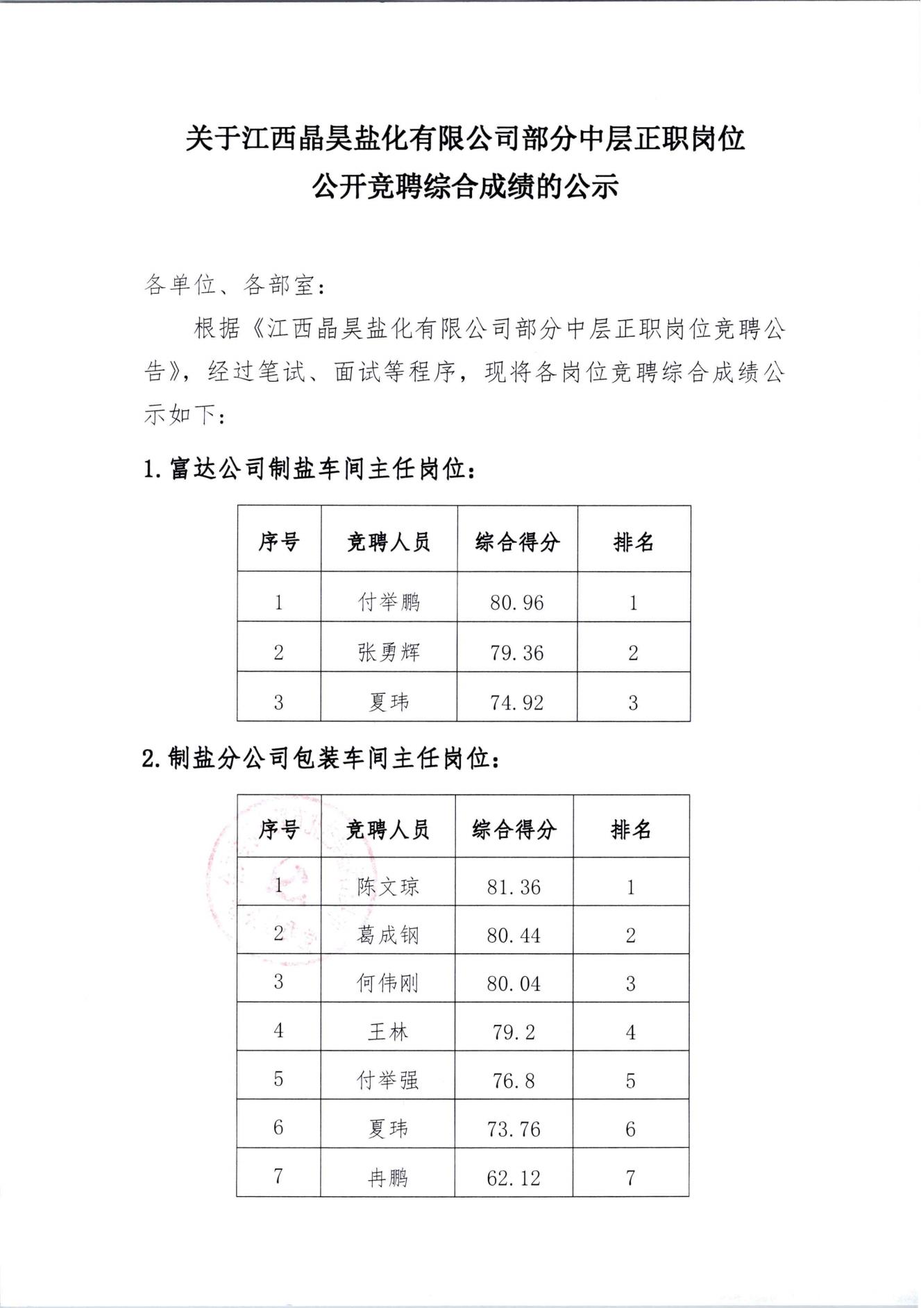 关于江西晶昊盐化有限公司部分中层正职岗位 公开竞聘综合成绩的公示