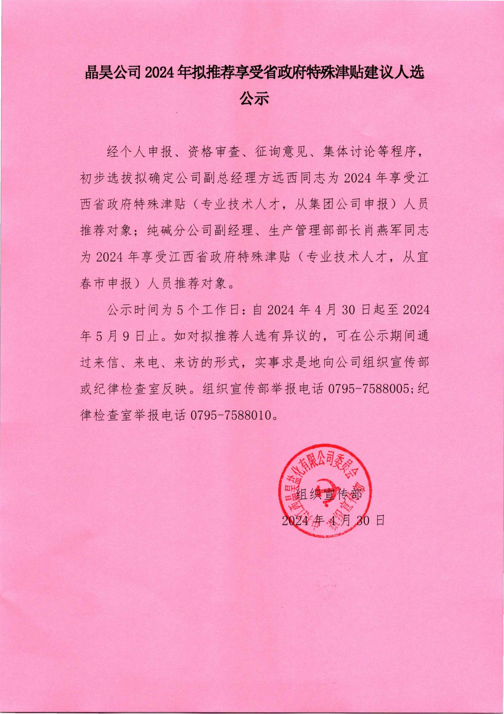 晶昊公司2024年拟推荐享受省政府特殊津贴建议人选公示