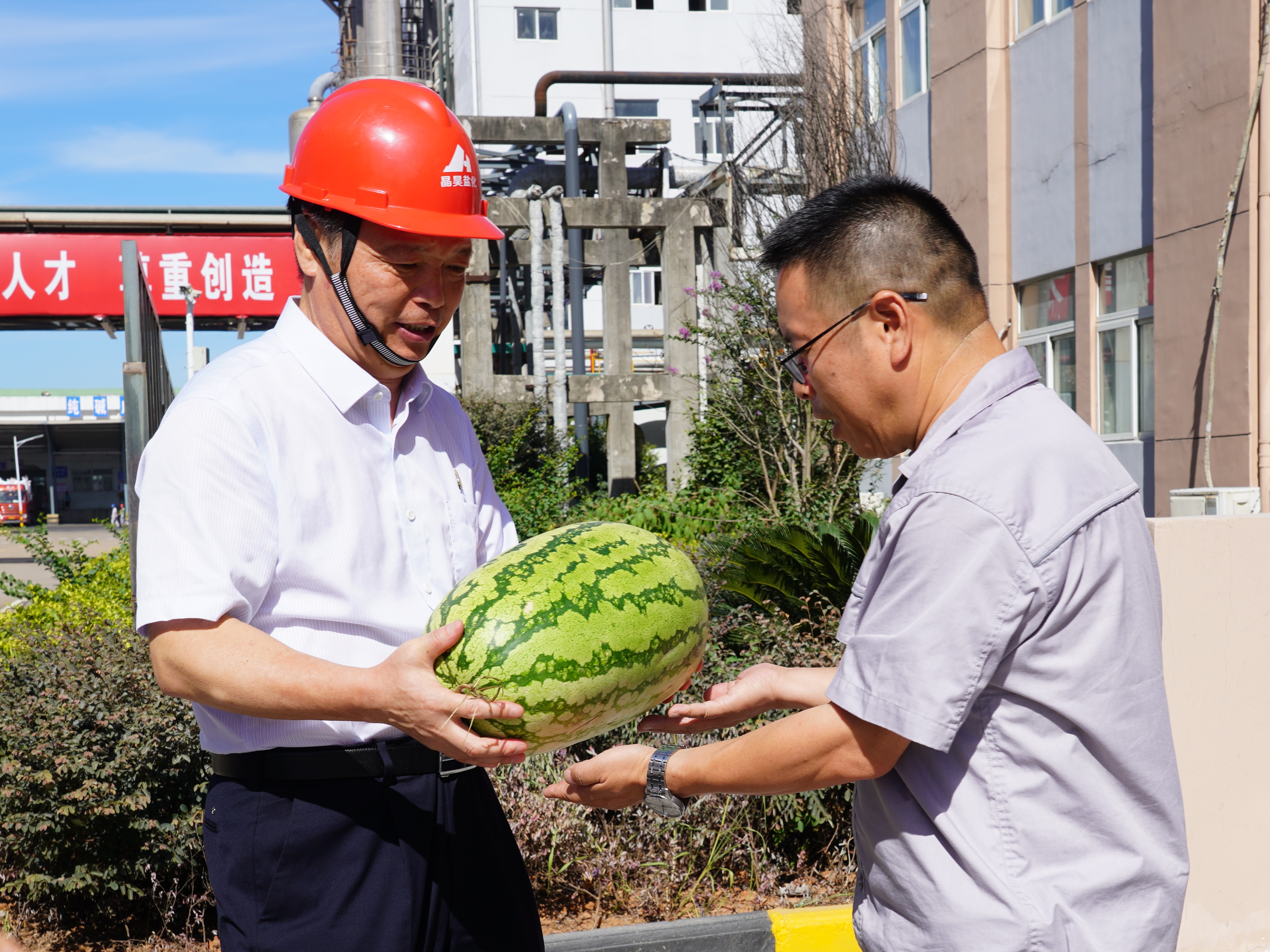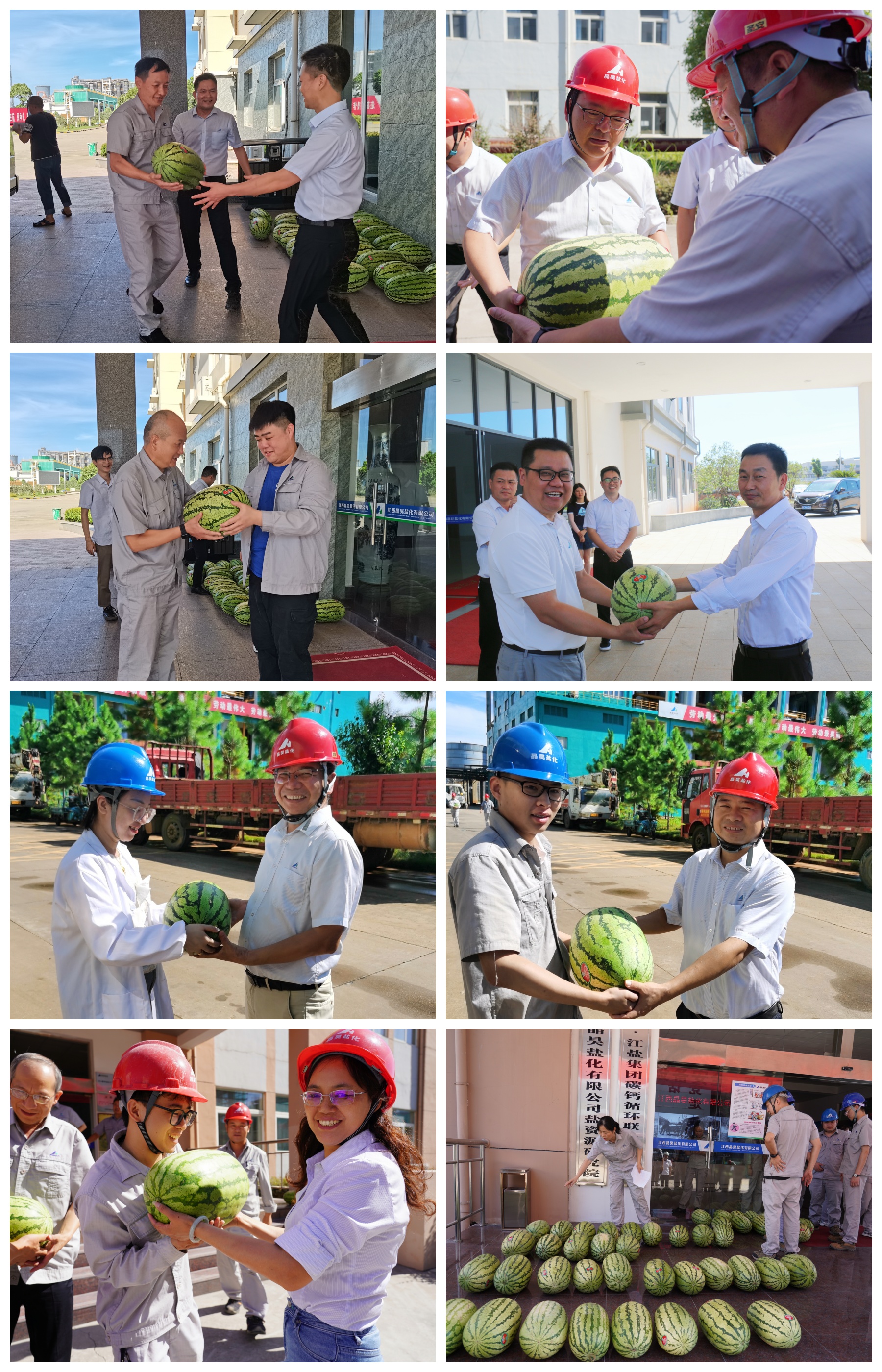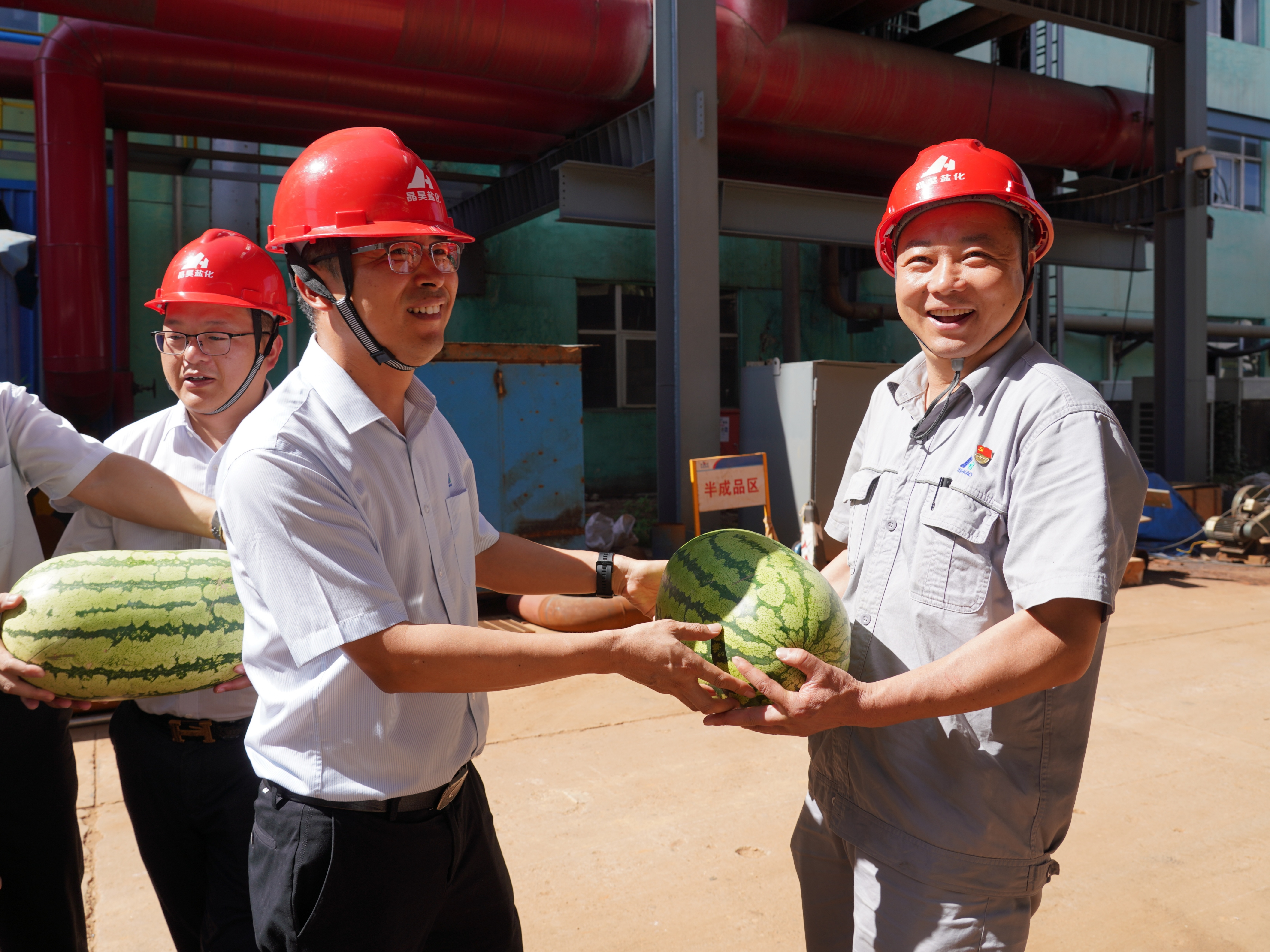 酷暑盛夏,热浪滚滚,高温“烤”验着每位奋战在一线的晶昊员工。为进一步维护基层一线劳动健康权益,7月18日上午,晶昊公司工会组织开展“工会送清凉,防暑保安康”慰问活动,公司党委书记、董事长雷和波,党委副书记、总经理徐晓峰和公司领导班子成员分别带队,组成5个慰问小组深入基层为一线员工送上防暑降温西瓜,把组织的关爱送到员工们的心坎上。