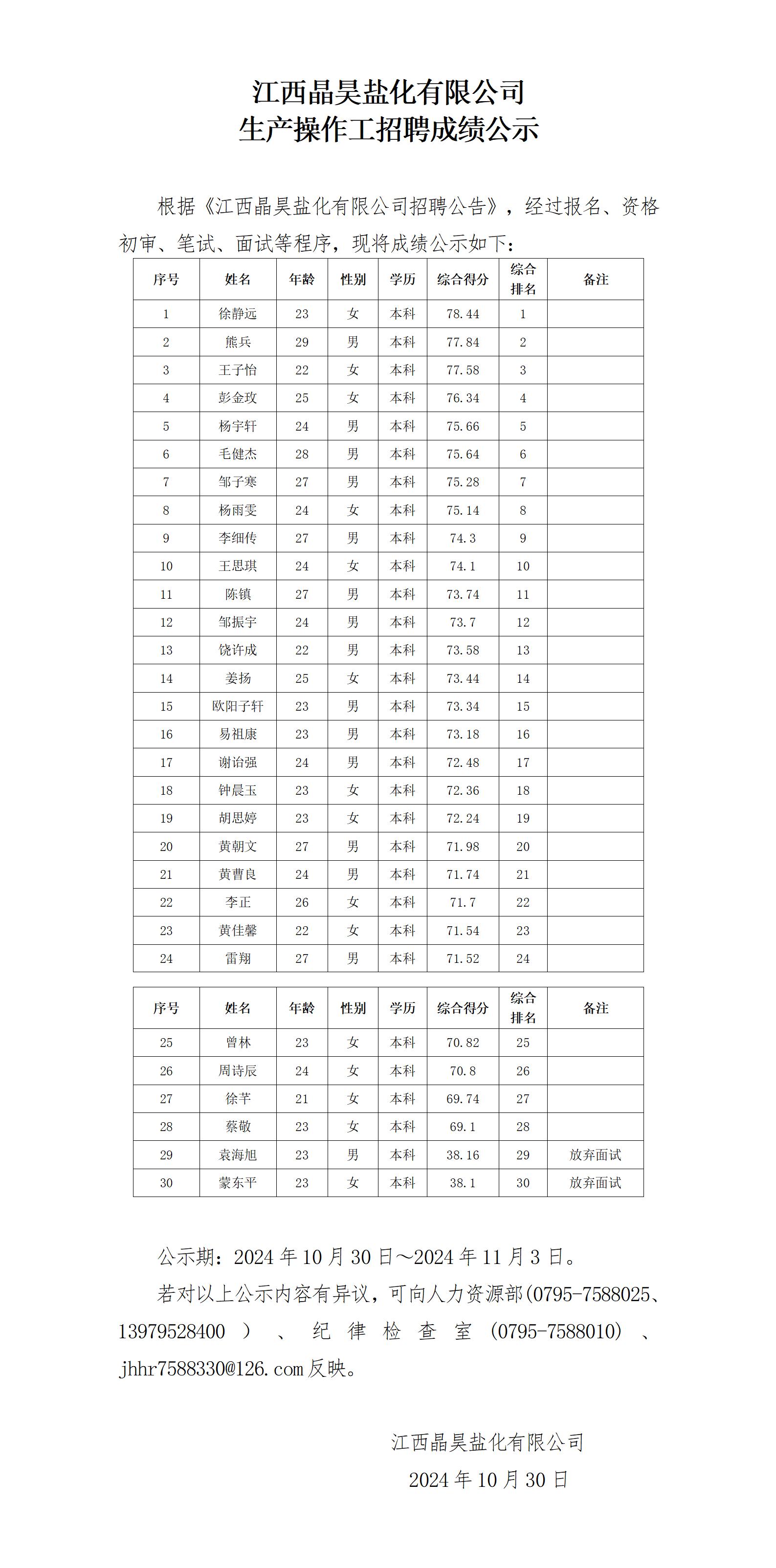 江西晶昊盐化有限公司生产操作工招聘成绩公示