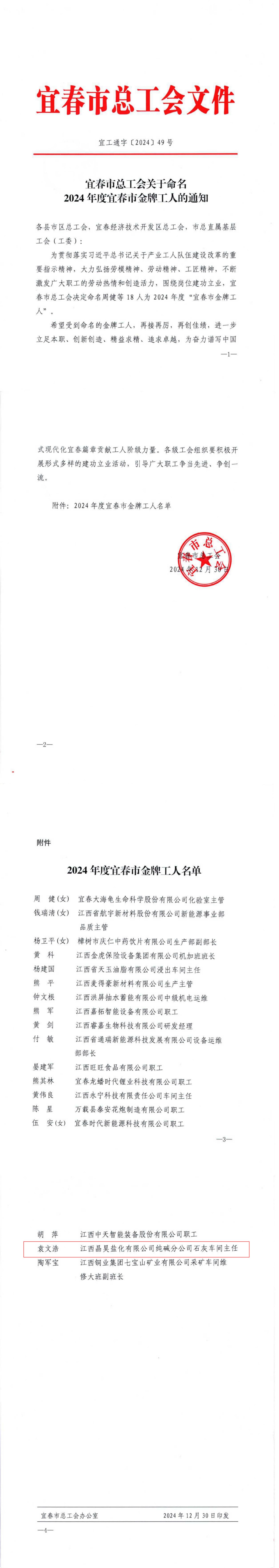 喜讯!晶昊公司车间石灰车间主任被评为2024年度“宜春市金牌工人”