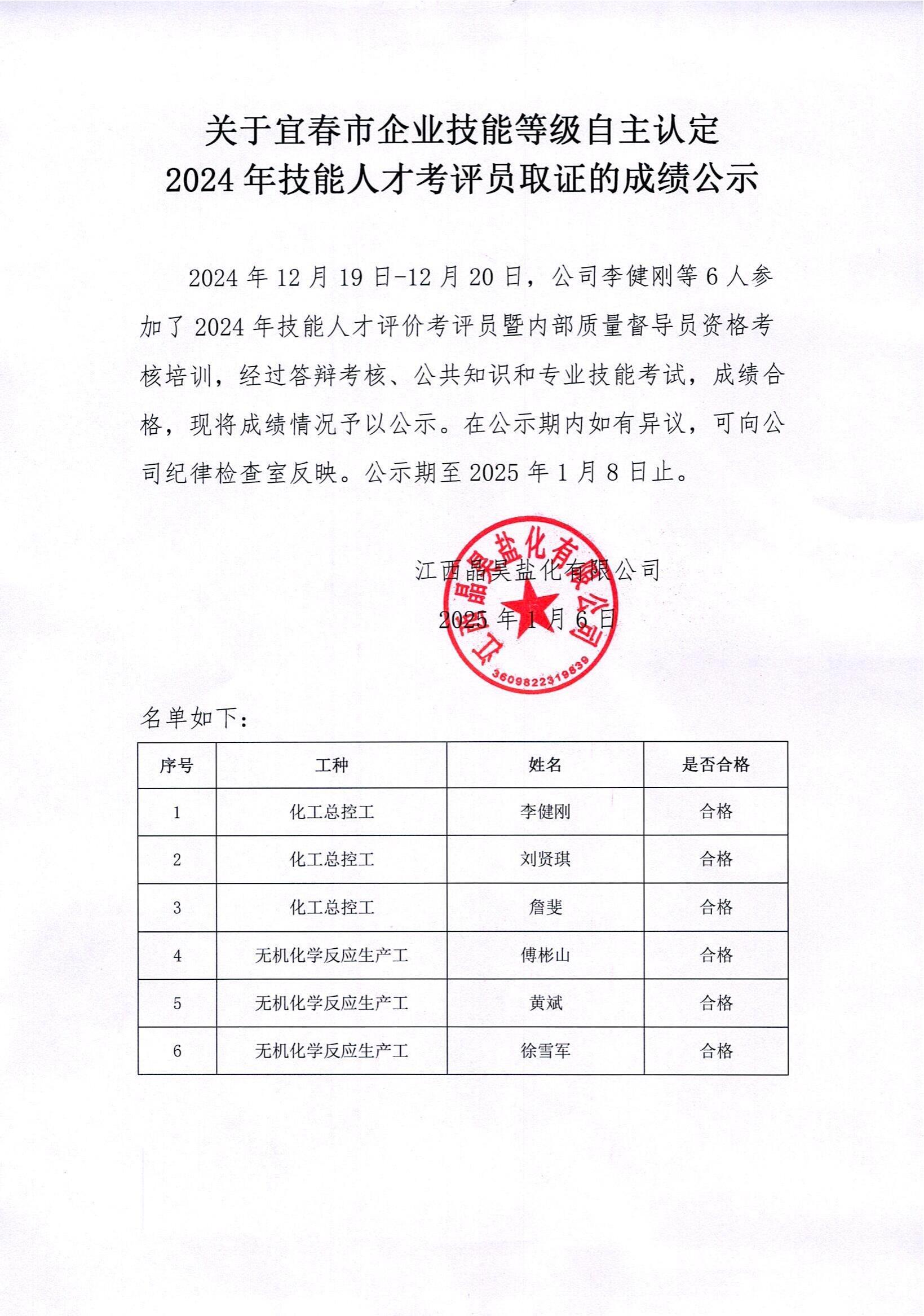关于宜春市企业技能等级自主认定2024年技能人才考评员取证的成绩公示