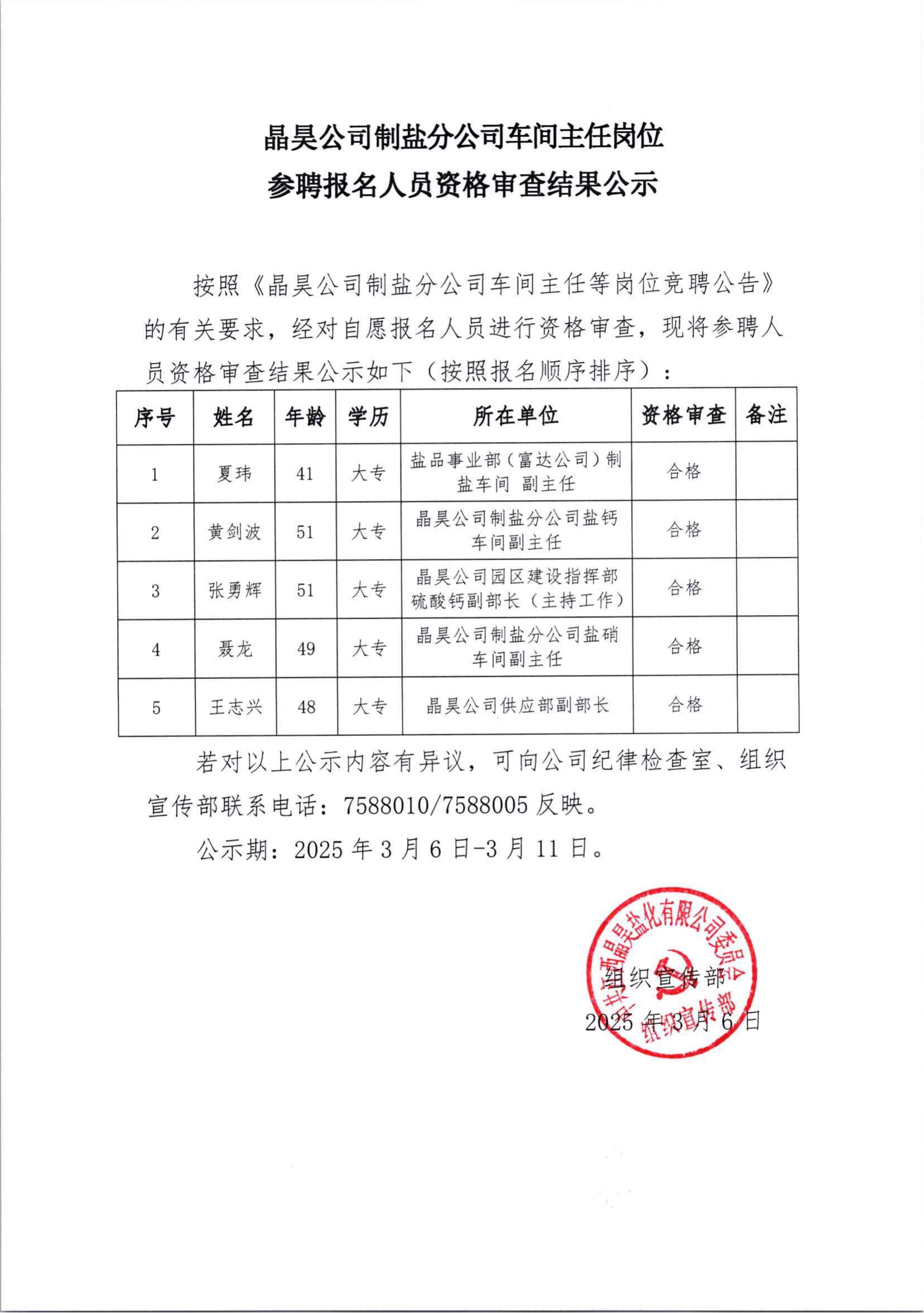晶昊公司制盐分公司车间主任岗位参聘报名人员资格审查结果公示
