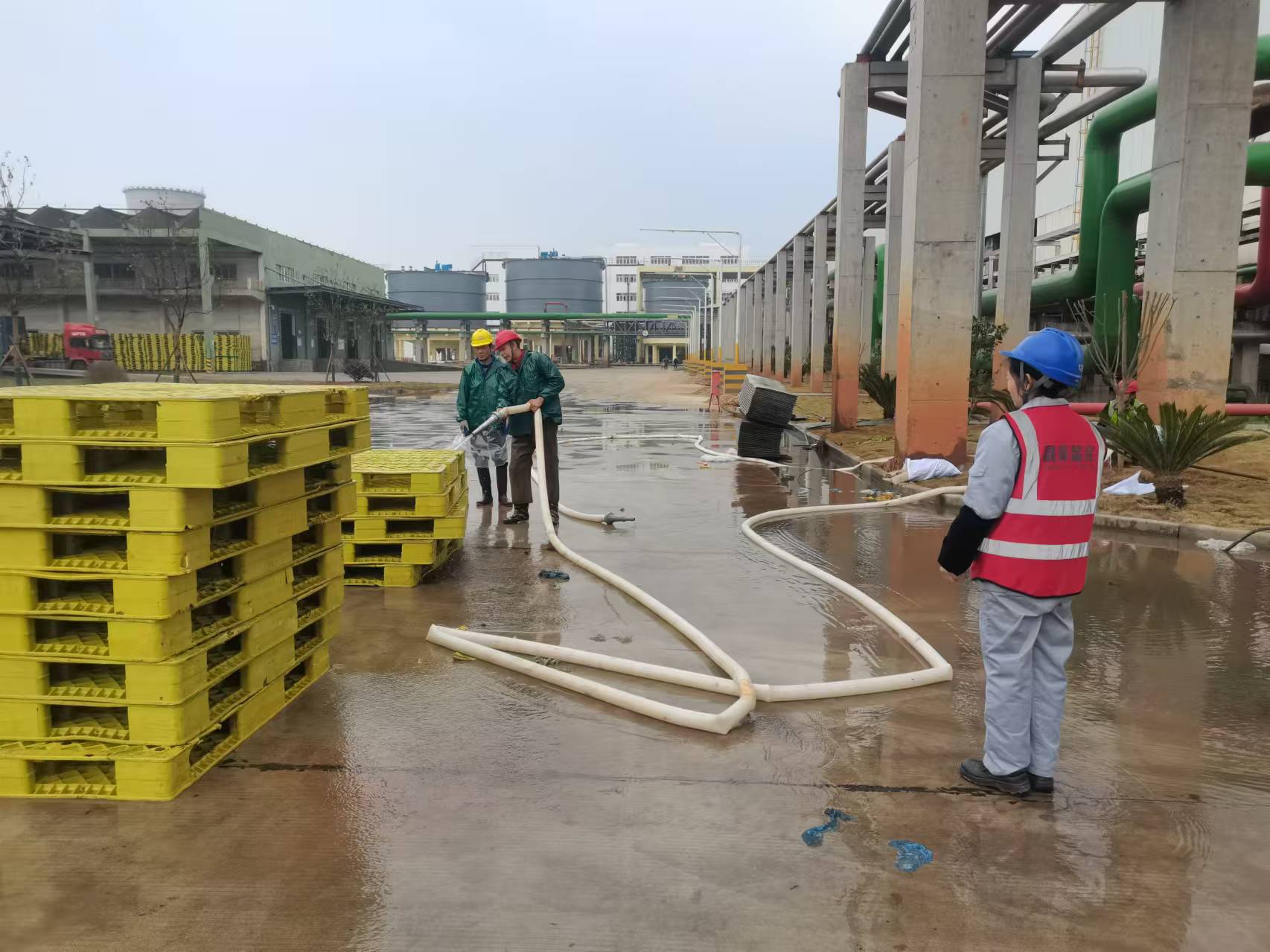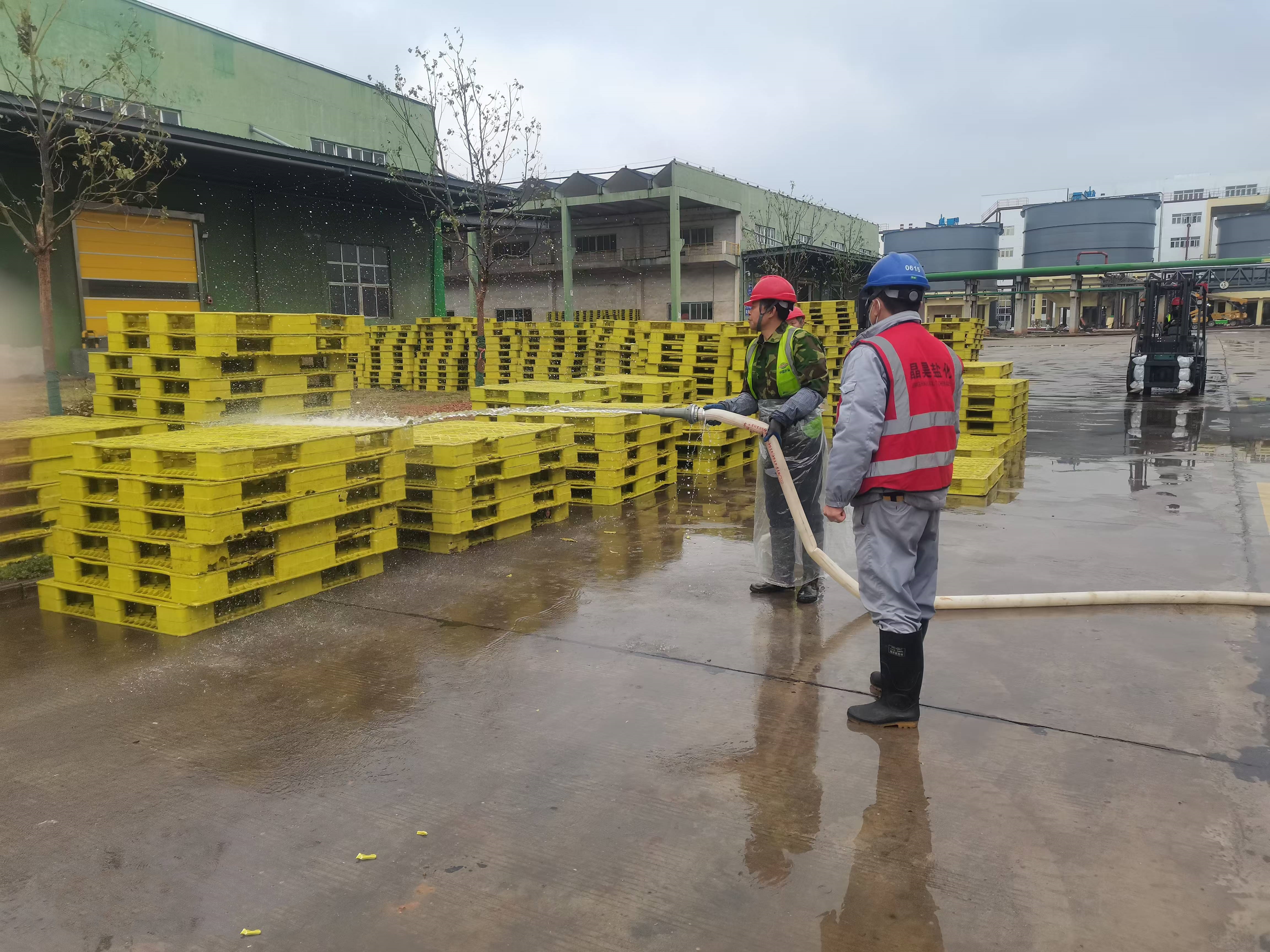 仓储中心盐硝成品库库区员工和外包单位人员共计15人脚穿套鞋、身穿雨衣,全副武装投入到这场托盘清洗的战役中。大家先将托盘转运至冲洗地点,再将托盘摆放开清洗第一面,紧接着将托盘人工翻转,对另一面进行清洗。清洗完毕后,托盘被整齐地码放,再转运至指定地点。整个清洗过程紧张而有序,每一个环节都紧密相连,没有丝毫的懈怠与疏忽。