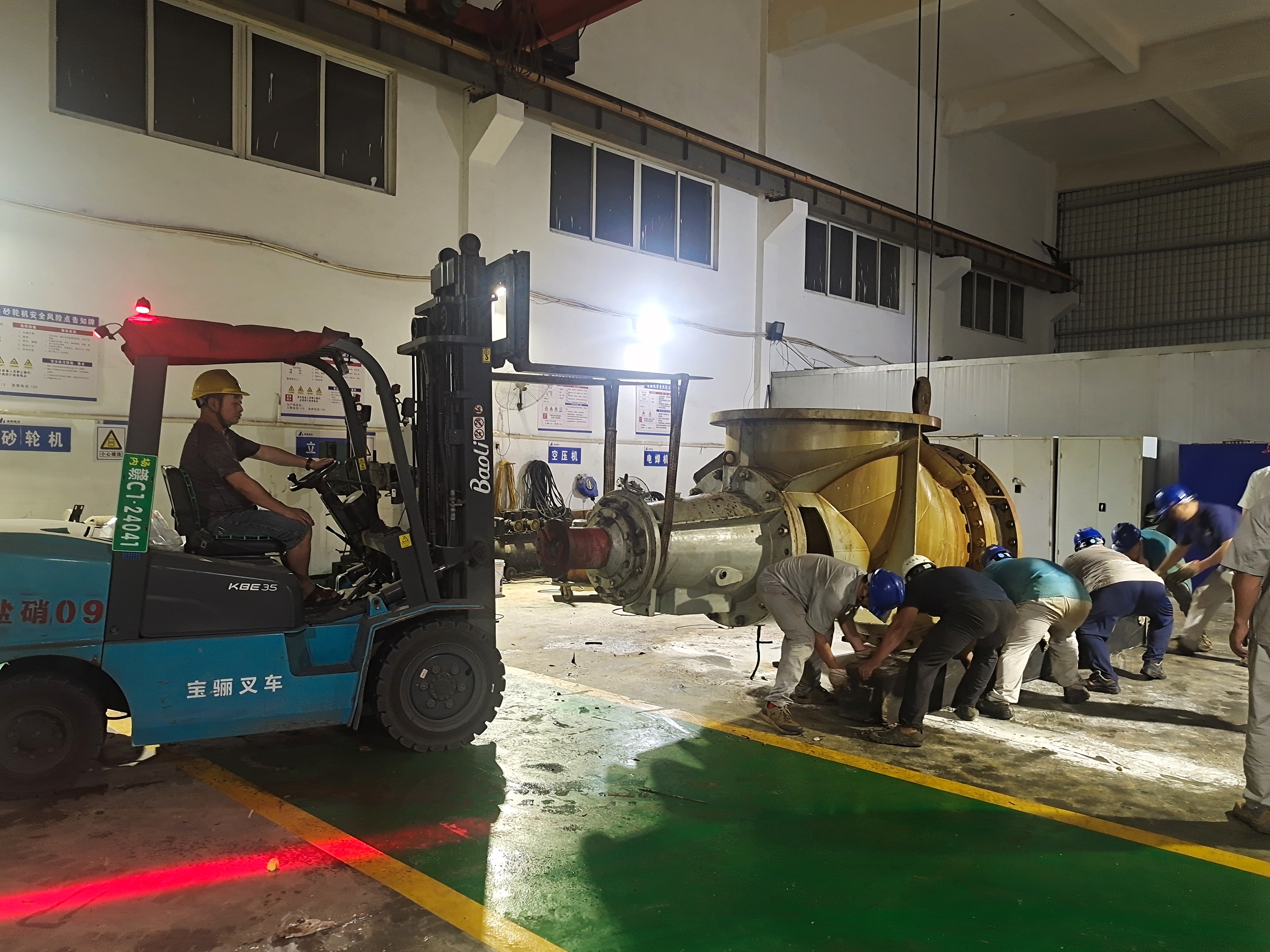 近日,晶昊公司制盐分公司盐钙车间关键设备循环泵P201突发机封漏水故障,若不及时修复将影响车间生产安全稳定运行。为了不影响公司正常生产,车间决定在两天内修复这台循环泵。制盐分公司生产技术部检修工段临危受命,组织党员突击队展开了一场与时间赛跑的抢修攻坚战。8月16日早上7点,检修人员到现场开始拆解螺栓。该循环泵作为盐钙生产系统的“核心”设备,其叶轮直径达1.1米,仅固定螺丝就有80多个,设备安装位置狭窄,大型吊装设备及电动工具都无法施展,只能靠传统的电动葫芦和扳手。大家克服闷热天气和狭小空间等困难,经过近7小时的奋战,终于将沉重的泵轴连同轴承箱、叶轮拆下。