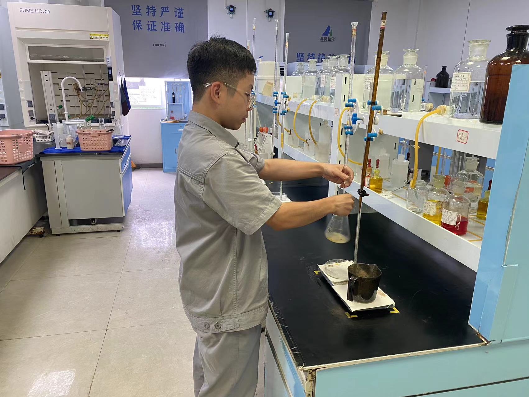 随着安全意识在心中筑牢根基,我怀着严谨的态度走进纯碱生产技术部的化验室,开启了倒班学习的旅程,这是将理论知识转化为实践技能的关键阶段,每一步都充满成长的意义。初入化验室,酸碱滴定管、各类指示剂、分光光度计、锥形瓶等仪器试剂映入眼帘,它们是我在校园实验室里的“老朋友”,每当目光触及,一股莫名的亲切感便悄然漫上心头,但在这里,它们却承载着截然不同的使命——监控生产质量,为生产流程“把关”。以往在校园,我仅需掌握这些仪器的基本操作方法;而在晶昊化验室里的每一次规范操作,都不是孤立的举动,是与生产质量同频共振的重要环节,直接关系着每一批产品的品质底色:硫酸溶液搭配甲基橙指示剂,能精准测定重碱的百分含量与氨盐水中游离氨的浓度;硝酸银溶液与铬酸钾溶液配合,可准确检测精盐水、氨盐水中氯离子的含量。这些试剂借助离子反应、配位反应、平衡移动、特定波长光吸收等原理,化身生产线上的“火眼金睛”,默默守护着厂区生产的稳定运行。更让我深受触动的,是化验室师傅们的专业与敬业:他们会手把手指导我如何精准完成样品测定,耐心纠正操作中的细节偏差;面对异常数据,他们从不敷衍,而是反复核查、多次验证,直到找到问题根源。这份对工作的严谨与负责,如同春雨般滋润着我,让我在学习技能的同时,更学会了何为“工匠精神”。