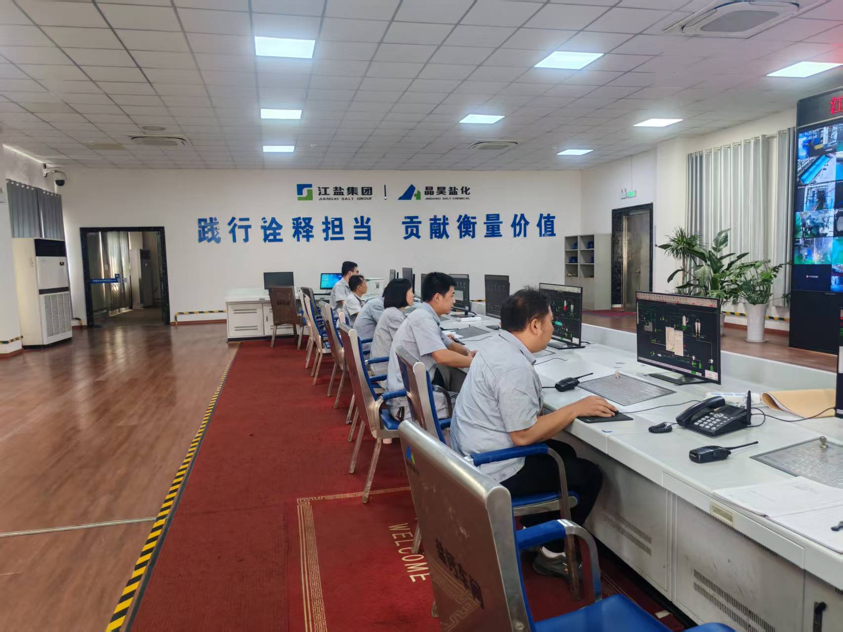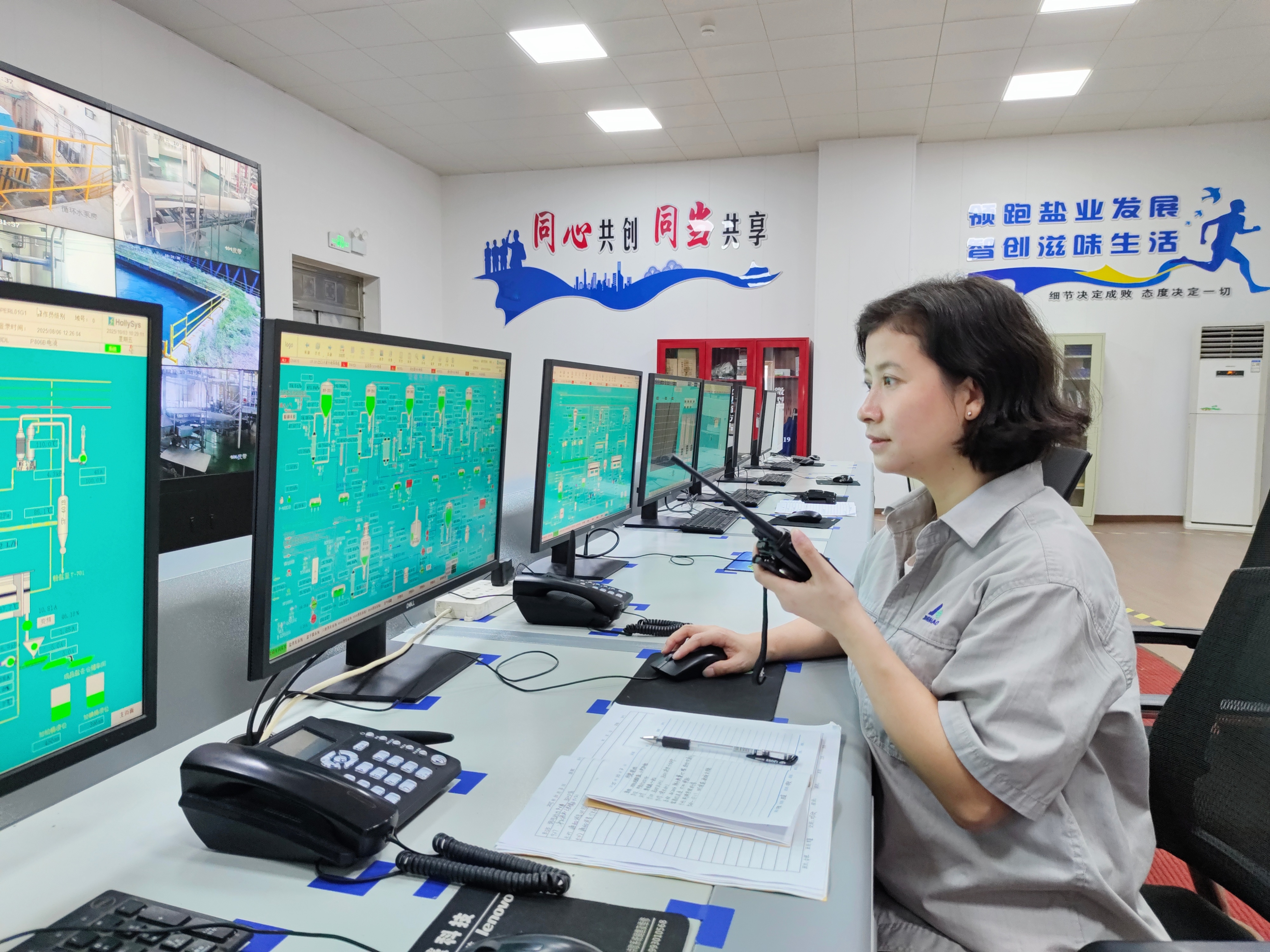 国庆假期,盐硝车间主控室里,李霞的身影格外亮眼。作为一线倒班员工,她坚守岗位,紧盯DCS系统,一手持对讲机、一手紧握鼠标,精准把控着每一项生产参数。从卤水浓度、蒸发罐温度、物料流量等核心参数到设备工况,李霞对每一个细节都“钉”得很实。从日常监盘到工艺协调,她用专业能力保障着制盐生产线的稳态运行。对讲机里不时传来她与现场操作人员的实时沟通声,座机旁不时出现她与其他车间的协调衔接身影,都是她爱岗敬业的生动注脚。