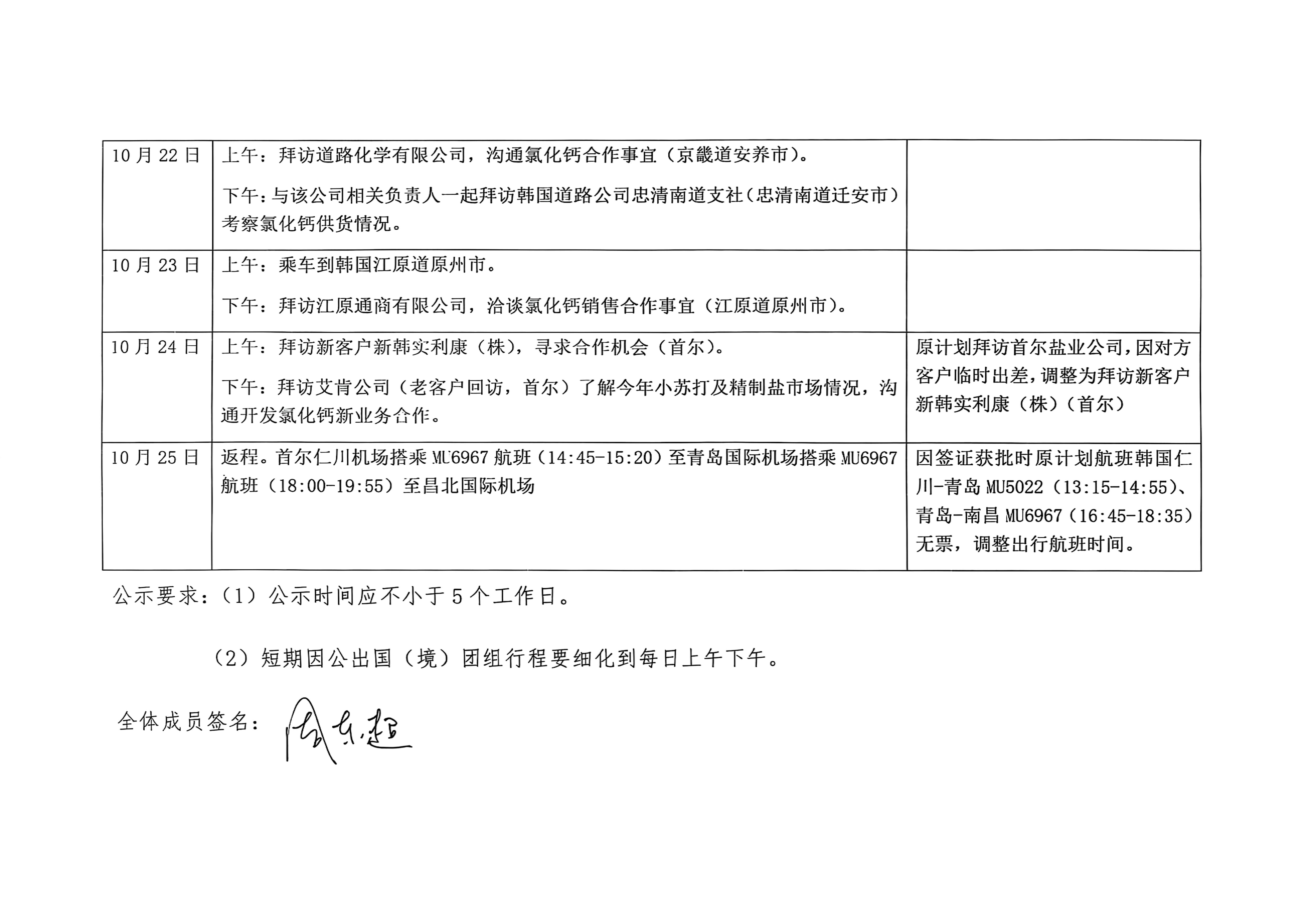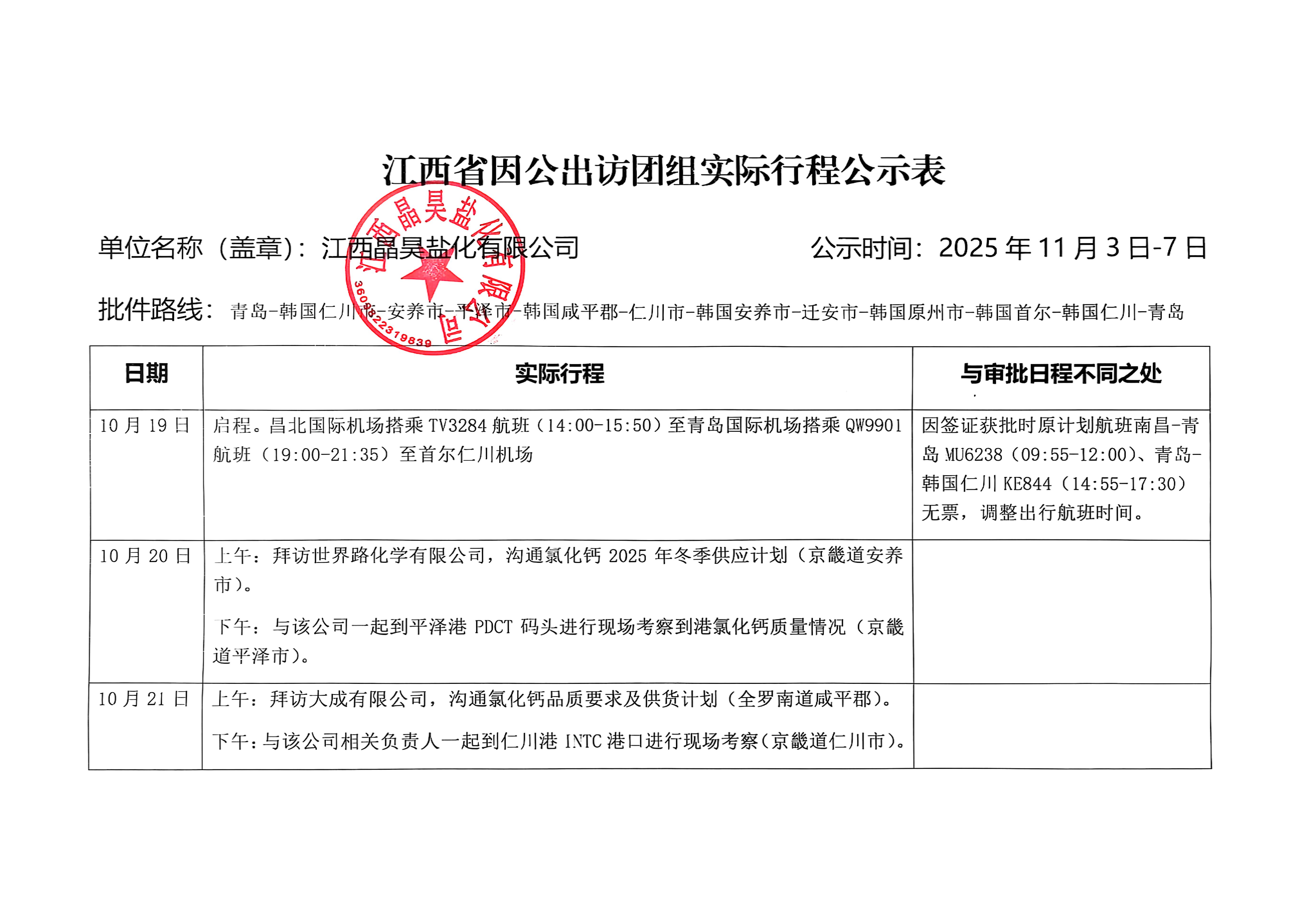 江西晶昊盐化有限公司因公出访团组实际行程公示表