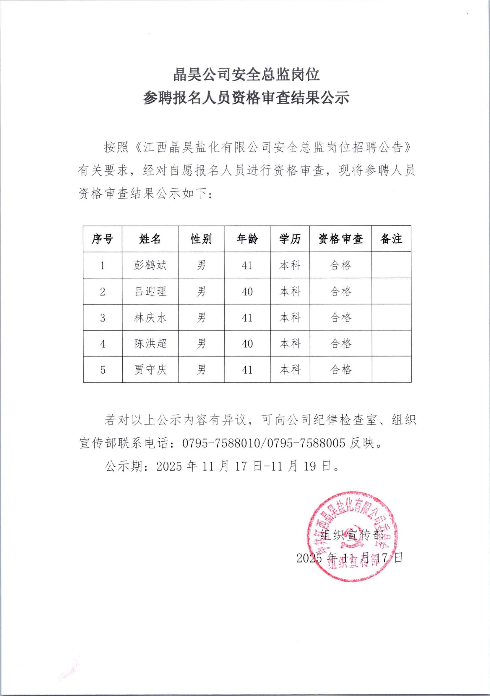 晶昊公司安全总监岗位参聘报名人员资格审查结果公示
