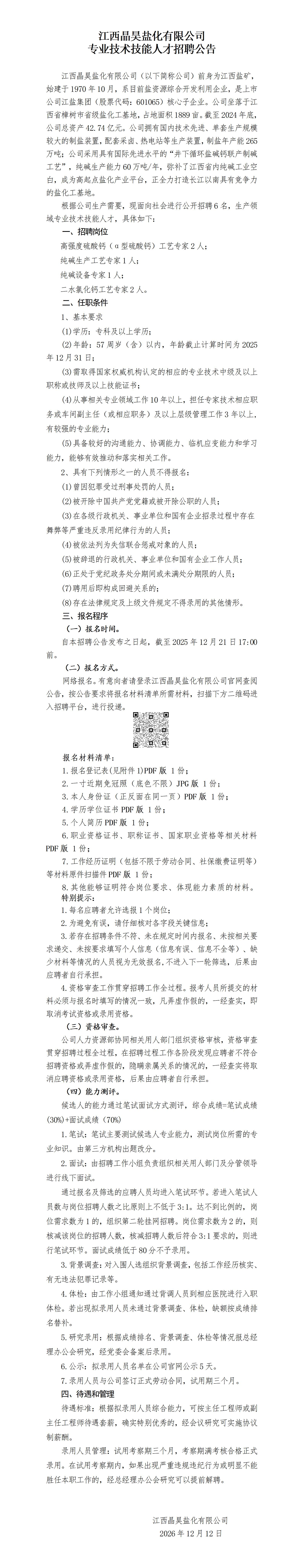 江西晶昊盐化有限公司专业技术技能人才招聘公告