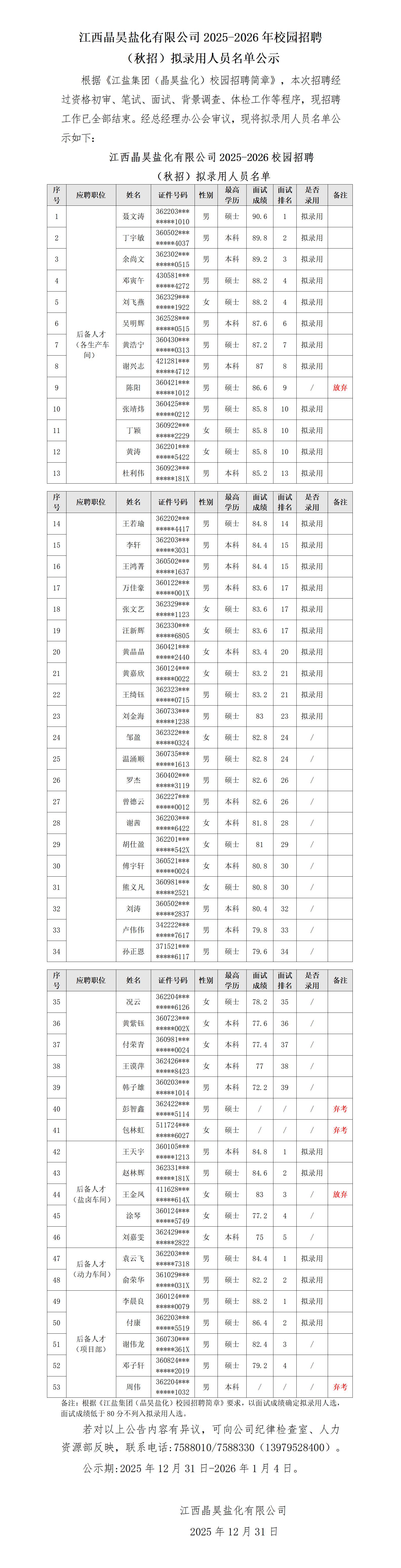 江西晶昊盐化有限公司2025-2026年校园招聘(秋招)拟录用人员名单公示