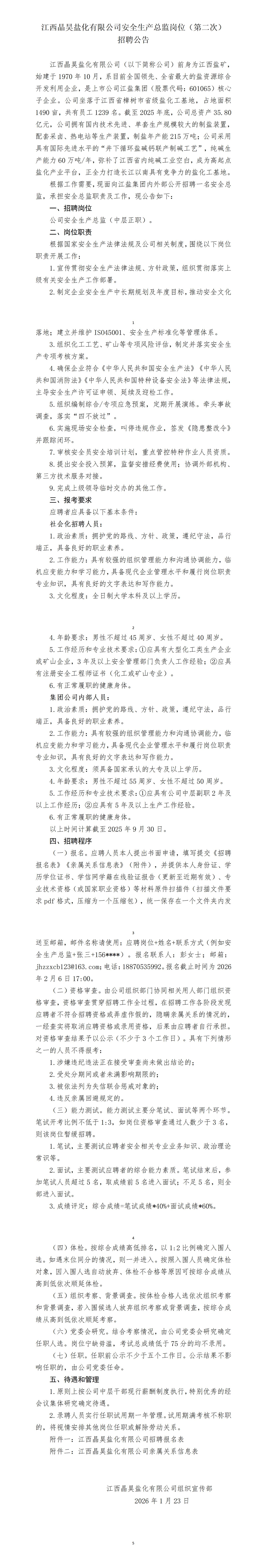 江西晶昊盐化有限公司安全生产总监岗位(第二次) 招聘公告