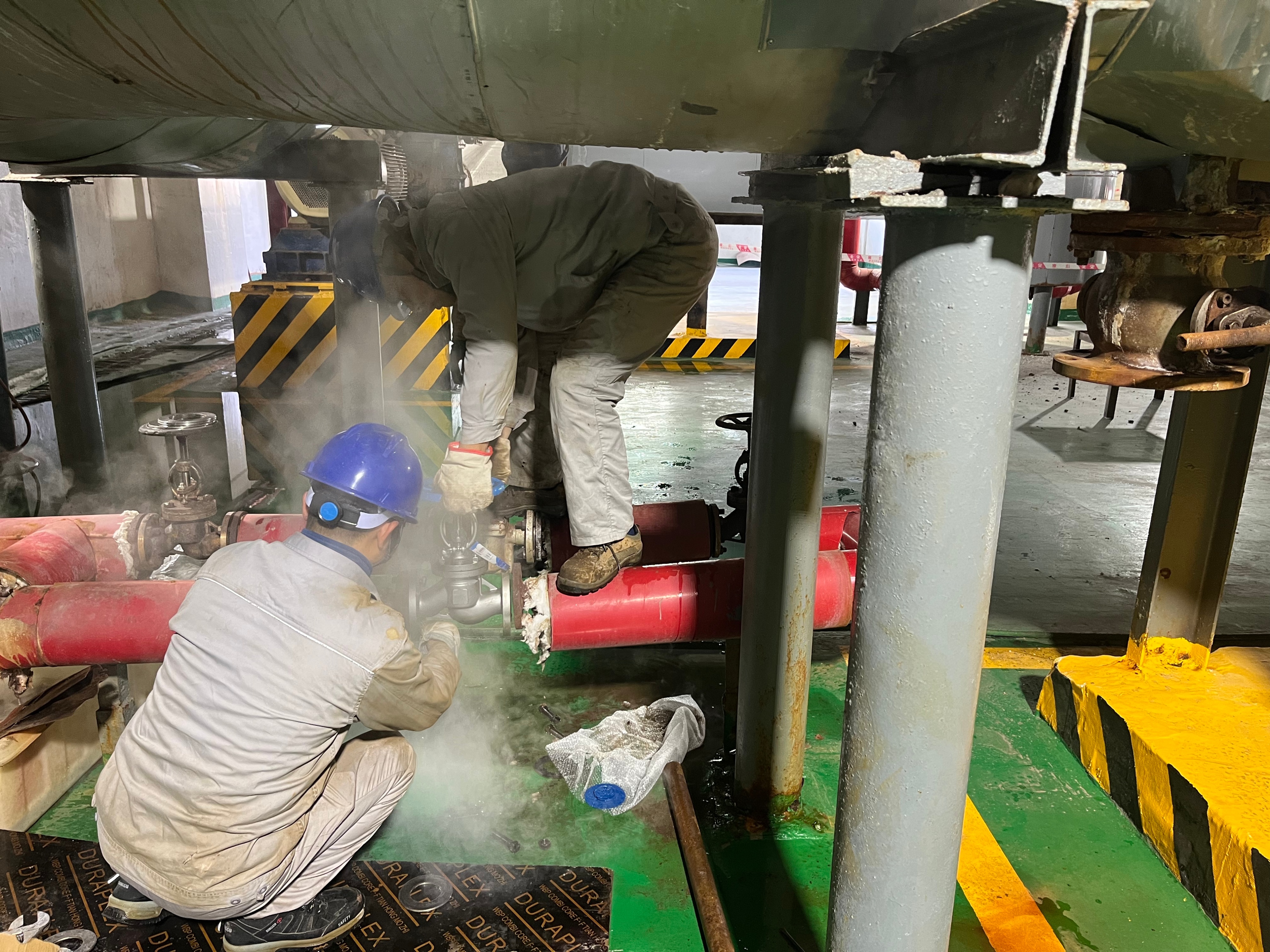 “党员先上!”车间的党员率先发声。车间立即成立党员突击队,分派人员在主控室负责DCS控制及指挥操作,现场人员同步关闭分支管路阀门,层层隔离风险源。负责技术、检修、安全的突击队员们携带设备直奔泄漏点,安全监护人员靠前划定警戒区、开展环境检测,筑牢安全防线。泄漏点位于管道密集区,作业空间狭窄,残留蒸汽使周围温度超过35℃,视线受阻、空间受限。突击队员冲锋在前,他们身着厚重防护装备,带头开展切割、打磨、焊接等高强度作业,成员分工协作,操作精准高效。经过6个多小时的连续奋战,泄漏点成功封堵,管道压力测试合格,管道恢复运行,生产线回归平稳。