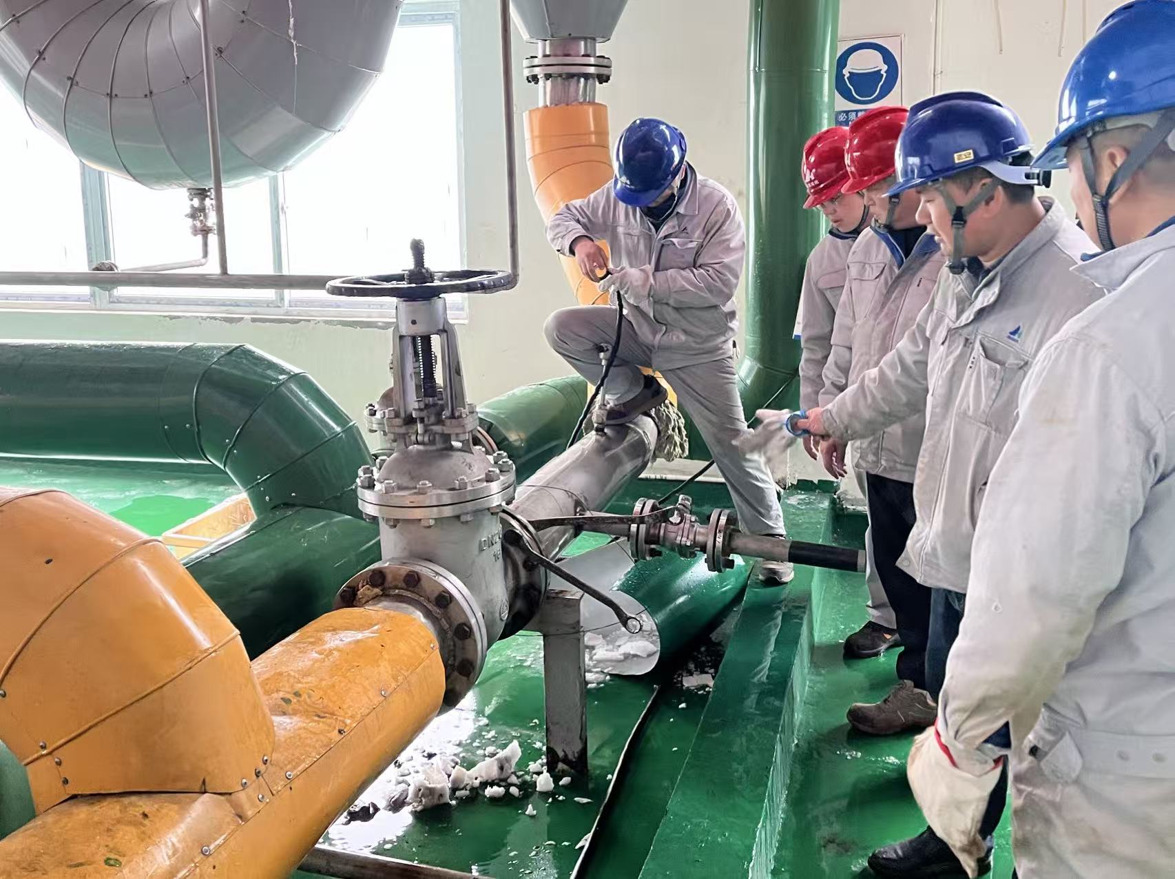 抢修工作紧张而有序,每一个动作都透着专业与严谨。前来抢修的突击队员们快速穿戴好防护用品,登上检修平台排查渗漏点,并精准操作焊接仪器加固管道,动作娴熟、一丝不苟;另一边,几名队员手持水管清理管道杂质,配合默契、高效协同。数九寒天,室外寒风刺骨,但抢修现场却暖意涌动。整个现场分工明确,配合默契,忙而不乱,没有一人叫苦,没有一人迟疑,只有党员徽章在光亮处熠熠生辉。