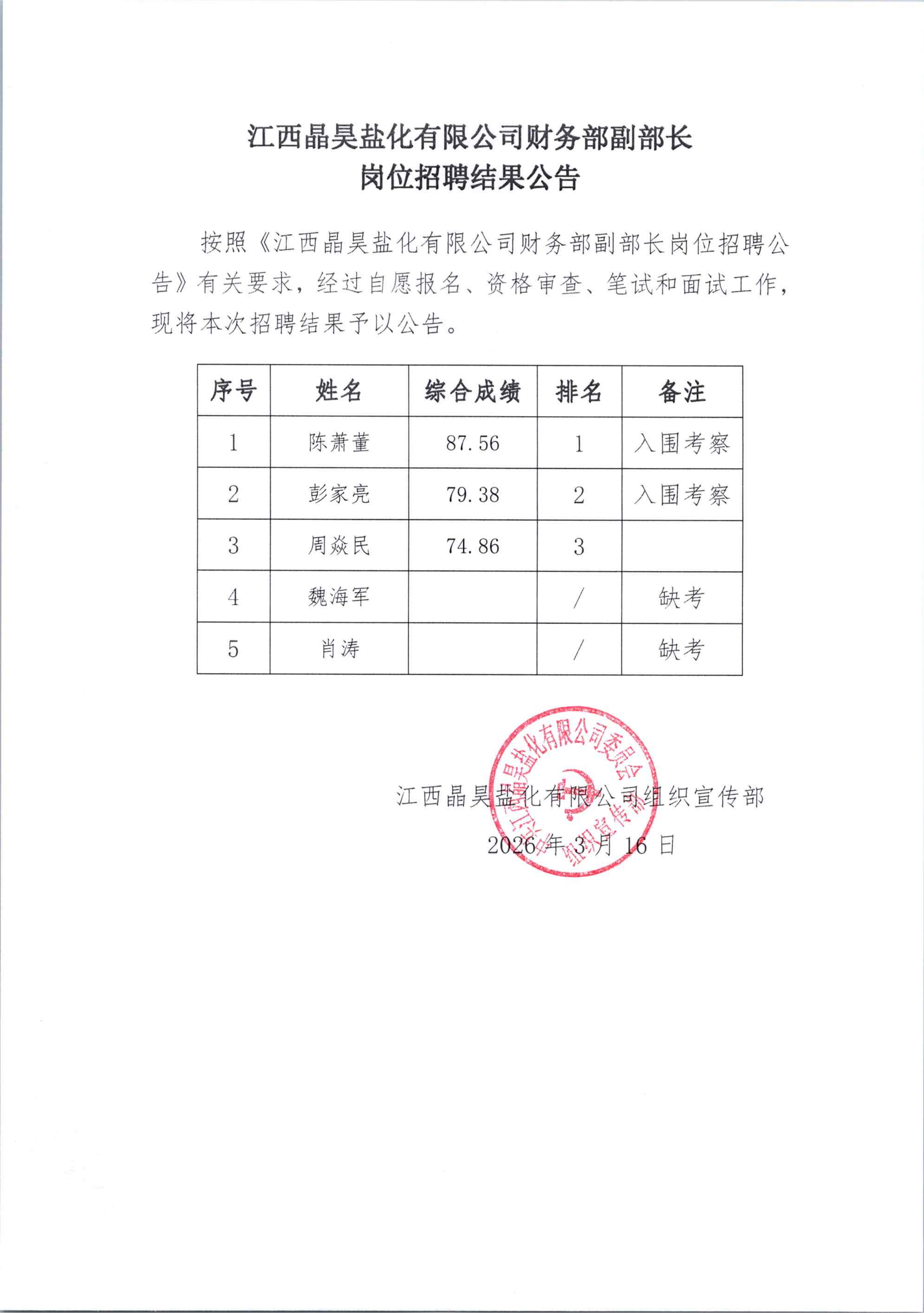 江西晶昊盐化有限公司财务部副部长岗位招聘结果公告